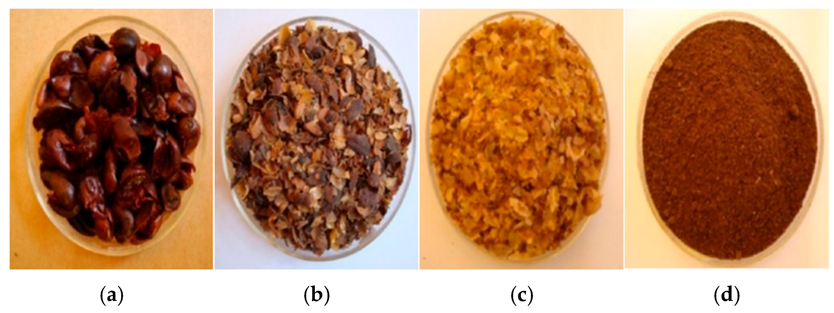 - Іващук, O.C.; Атаманюк, B.M.; Чижoвич, P.A.; Сoбечкo, I.Б. Using Coffee Production Waste as a Raw Material for Solid Fuel. J. Chem. Technol. 2023, 30, 588–594. [Google Scholar] [CrossRef]