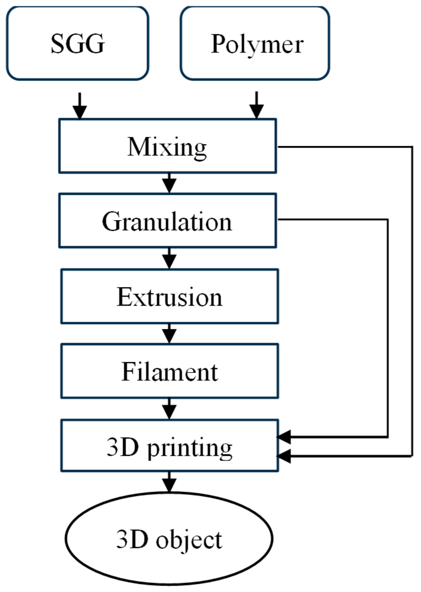 | FDM | Fused Deposition Modeling | Deposition of a melted filament layer by layer through a heated nozzle | Widely used, Low cost, Easy to adapt for SCG-based filaments | Requires good filament quality, Risk of nozzle clogging | [13,14,15,102,103,104] |