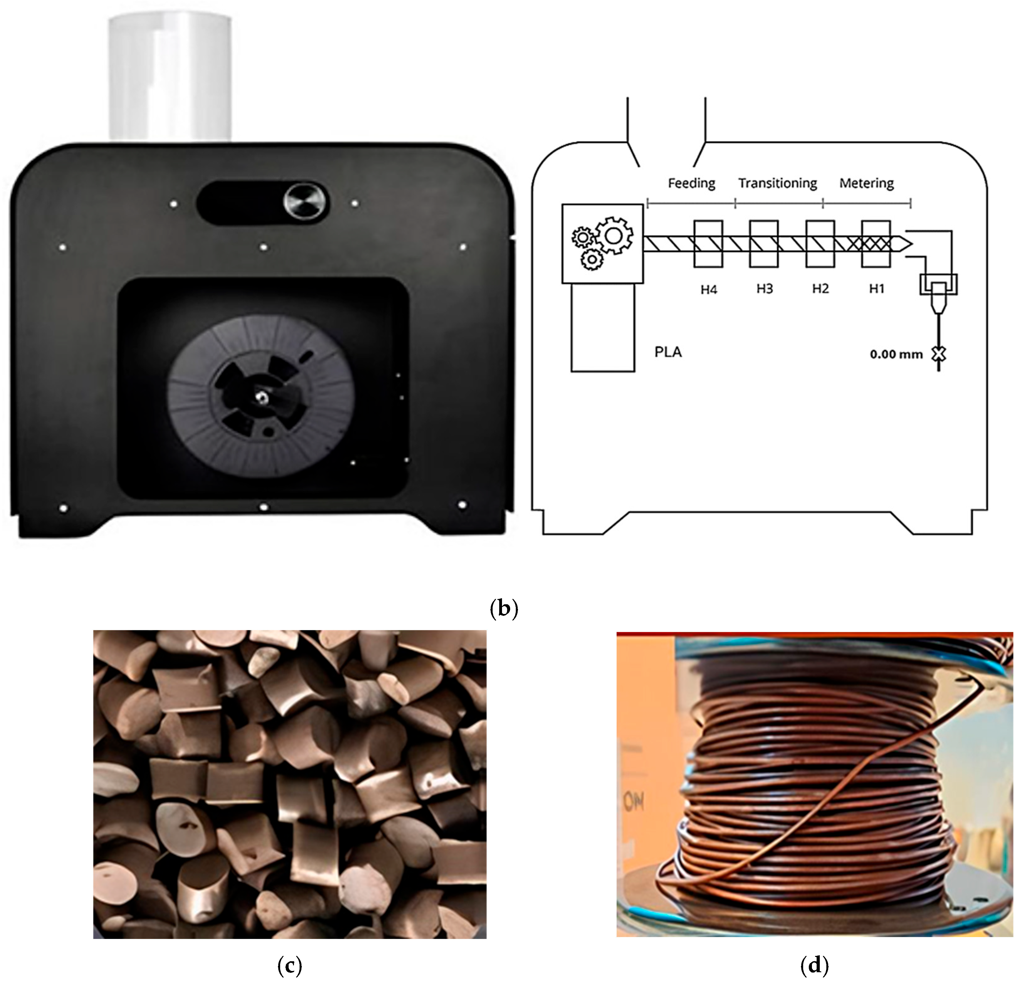 - Paramatti, M.; Romani, A.; Pugliese, G.; Levi, M. PLA Feedstock Filled with Spent Coffee Grounds for New Product Applications with Large-Format Material Extrusion Additive Manufacturing. ACS Omega 2024, 9, 6423–6431. [Google Scholar] [CrossRef]