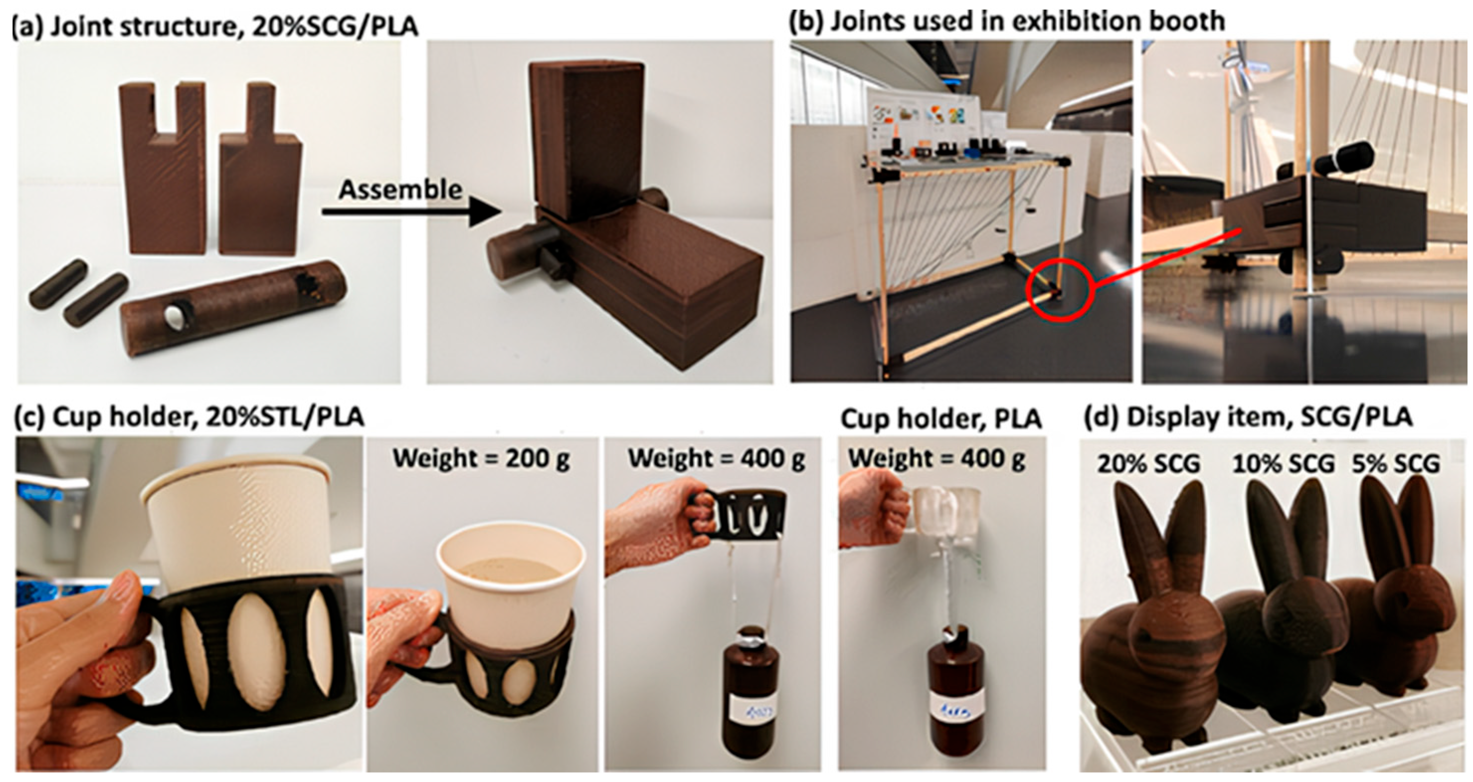 - Mak, S.L.; Tang, W.F.; Li, C.H.; Lee, C.C.; Wu, M.Y.; Chak, W.Y.; Kwong, W.K. Spent Coffee Ground–Based Polymeric Materials for 3D Printing. In 3D Printing and Sustainable Product Development; CRC Press: Boca Raton, FL, USA, 2023; pp. 125–138. [Google Scholar]