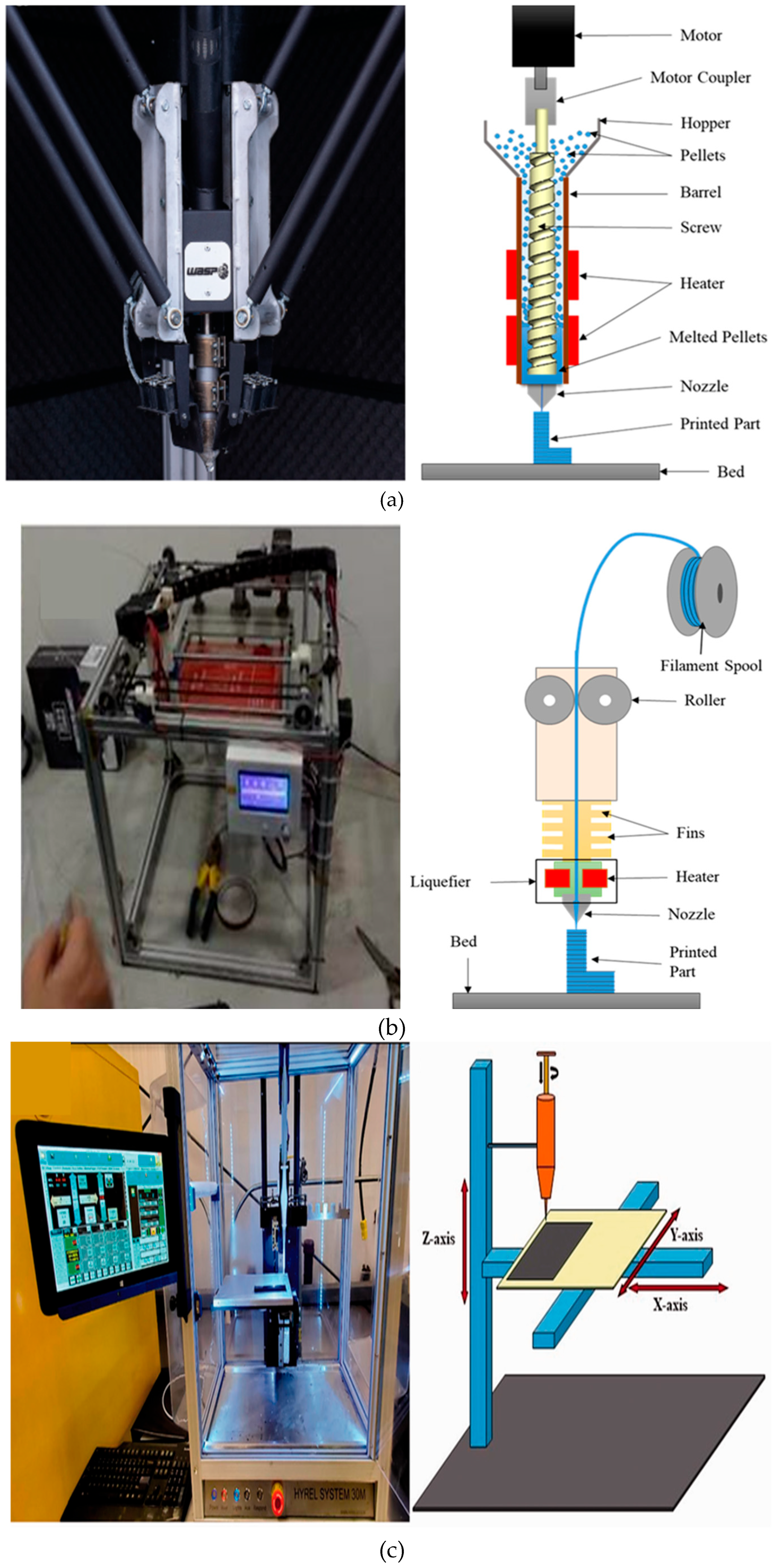 | FGF | Fused Granular Fabrication (Pellet-based) | Direct extrusion of melted polymer pellets without filament | Uses raw pellets, Lower material preparation, and Cost-effective | Less common, more complex process control | [17,18] |