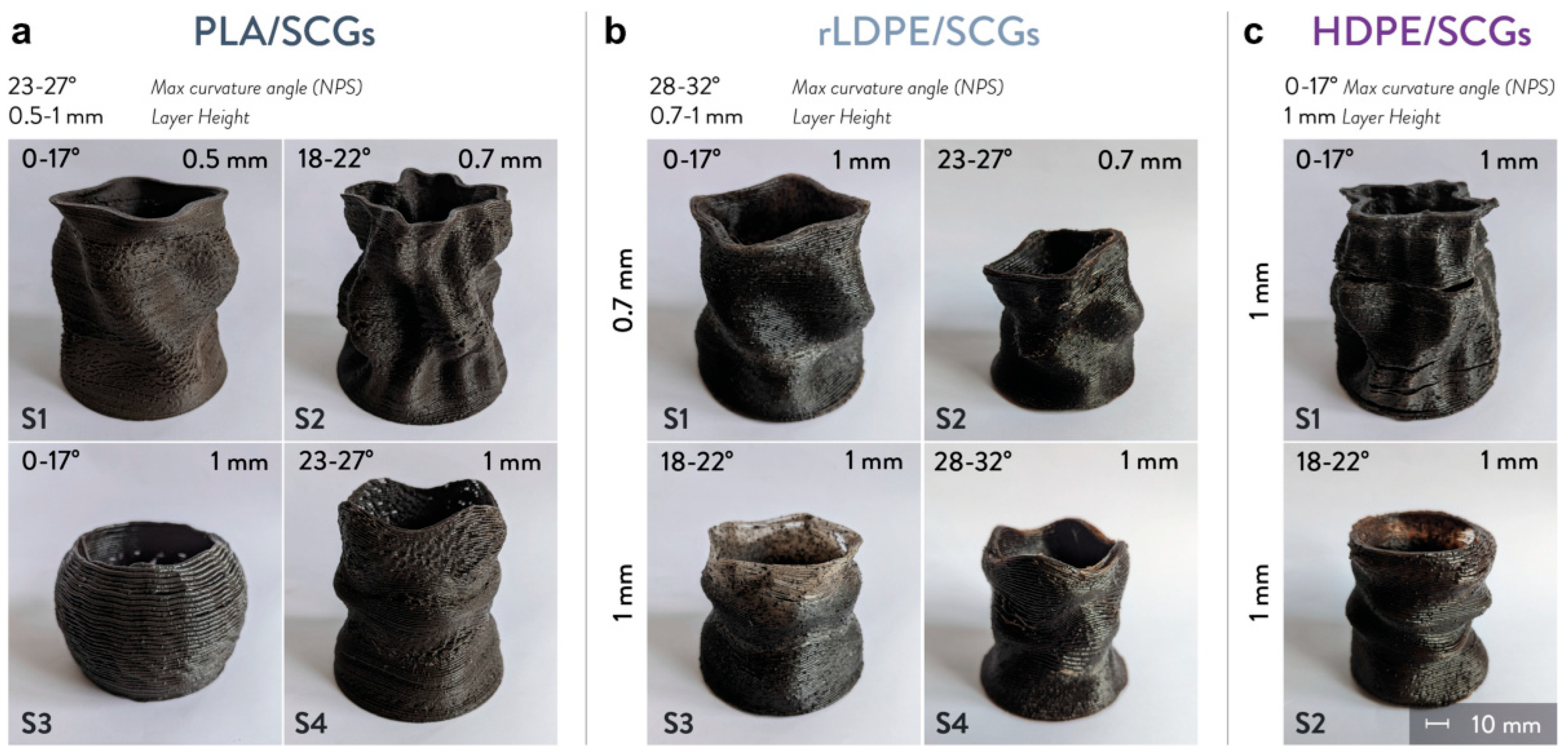 | PLA, LDPE and HDPE | SCG | 10 | >900 µm | _ | FGF | PLA/SCG composites exhibit stable tensile strength (13.9 MPa) and higher elongation at break (3%) compared to conventional filaments. The elastic modulus varies, with rLDPE/SCGs reaching 107.4 MPa and HDPE/SCGs 587 MPa. The composites show non-Newtonian behavior, with decreasing viscosity improving printability. | [18] |