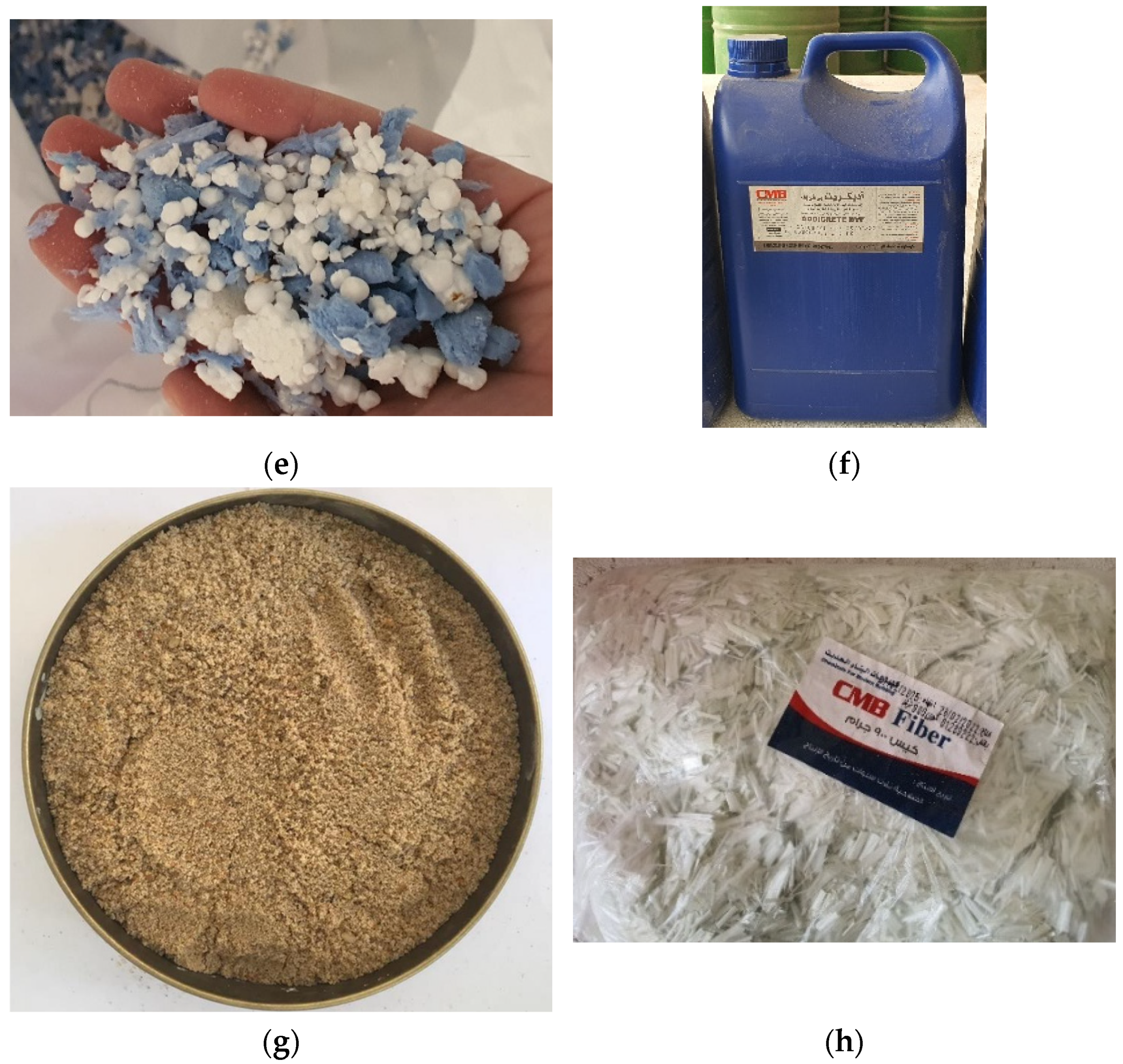 3). To compensate for the reduced workability associated with lightweight mixes, a high-range water-reducing admixture (HRWRA), Addicrete BVF (CMB, Giza, Egypt), was used. Additionally, alkali-resistant polypropylene microfibers were added to enhance crack resistance, control early-age shrinkage, and improve ductility, particularly under localized punching shear loads.