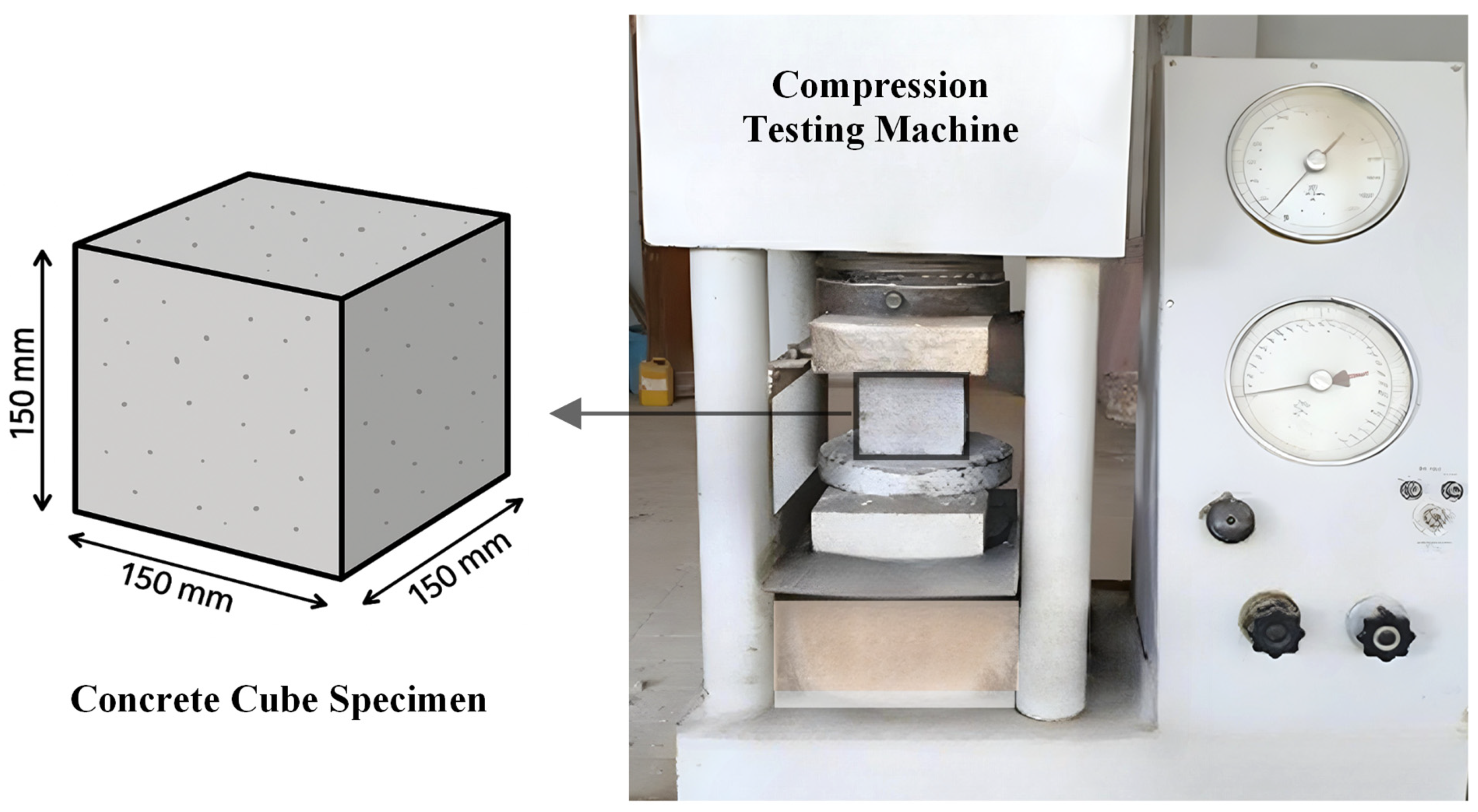 The average compressive strength of the concrete was 14.8 MPa, determined from six standard cubes with dimensions of 150 mm × 150 mm × 150 mm, and tested using a compression testing machine, as shown in