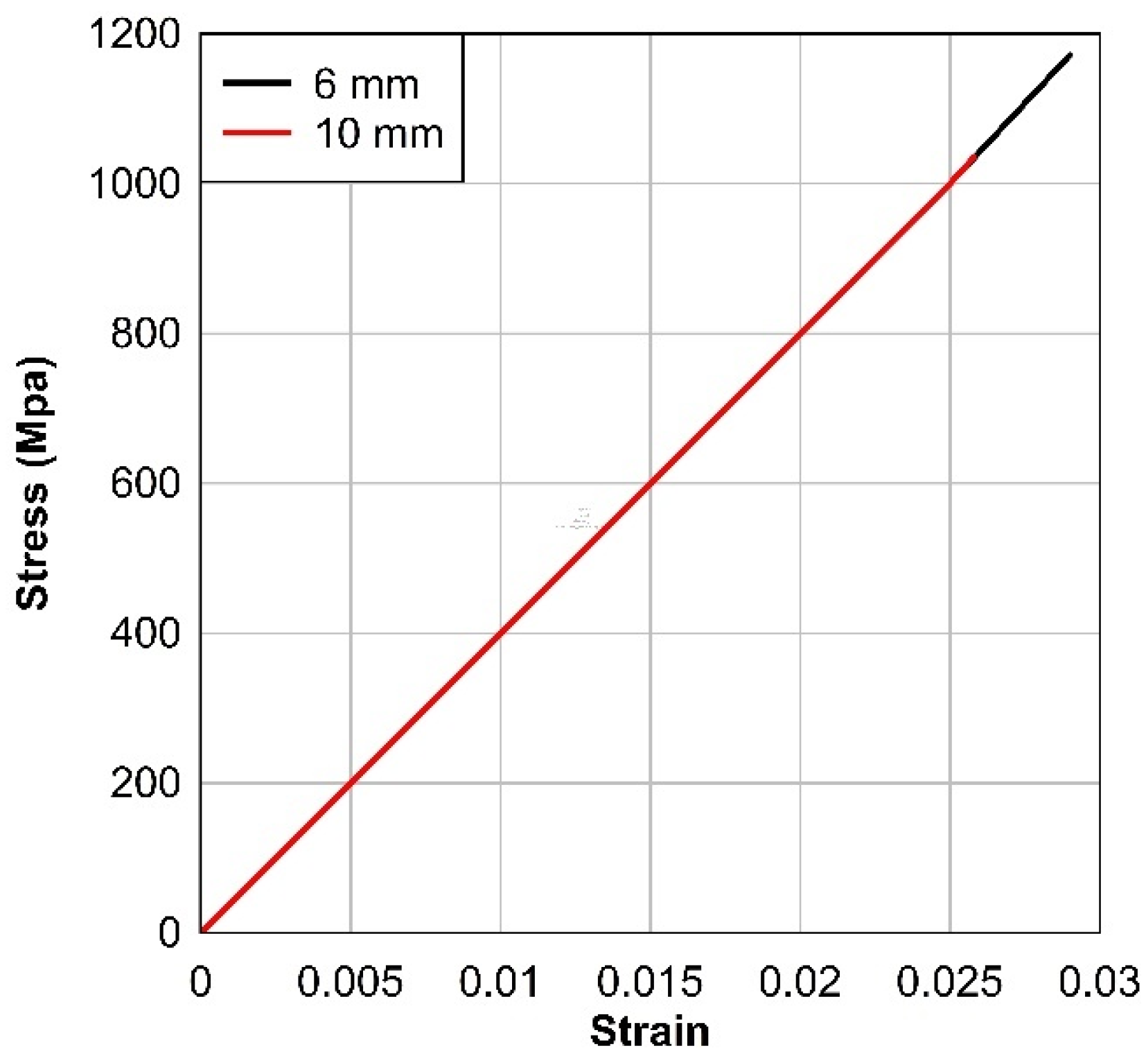 27]. Experimental stress–strain data showed linear elastic behavior up to failure, with the 6 mm and 10 mm GFRP bars reaching rupture at approximately 2.6% and 2.9% strain, respectively. The calculated elastic modulus for both GFRP bar sizes was approximately 40 GPa, based on the slope of the stress–strain curves shown in