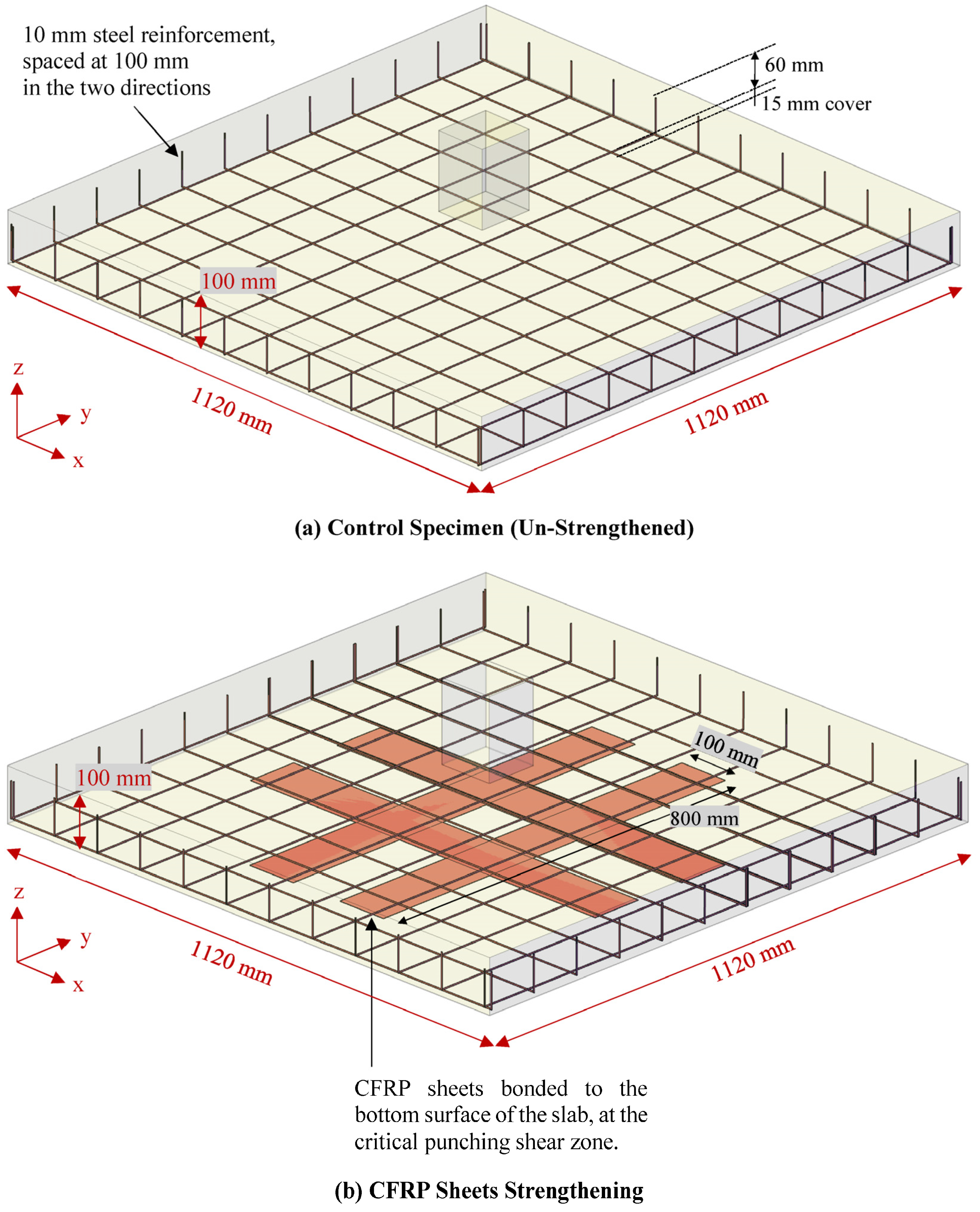 Externally bonded carbon fiber-reinforced polymer (CFRP) sheets were also used for slab strengthening. The CFRP material had an ultimate tensile strength of 3400 MPa, an elastic modulus of 230 GPa, and an ultimate strain of 1.5%, as per the manufacturer’s datasheet. The CFRP sheets were applied using a two-part epoxy adhesive system, with surface preparation carried out in accordance with standard bonding protocols.