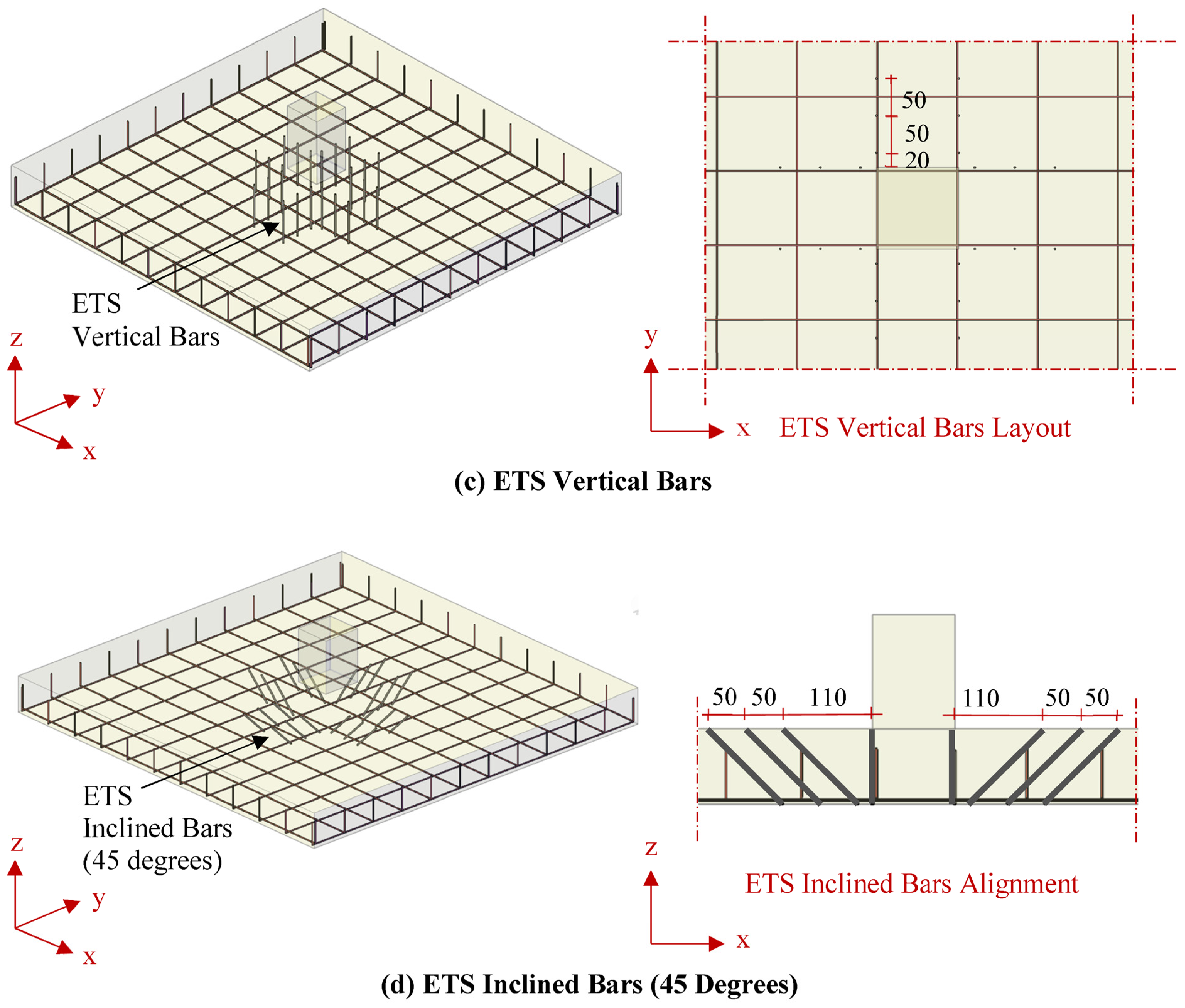 For inclined ETS reinforcement, the bars were positioned diagonally to intersect the anticipated punching shear cracks at approximately 45°, providing more effective crack arrest and enhanced shear transfer compared to vertical bars. Close spacing (0.6 d) resulted in a denser reinforcement grid that intercepted more shear cracks, while wider spacing (1.2 d) reduced the effectiveness due to fewer crack intersections.
