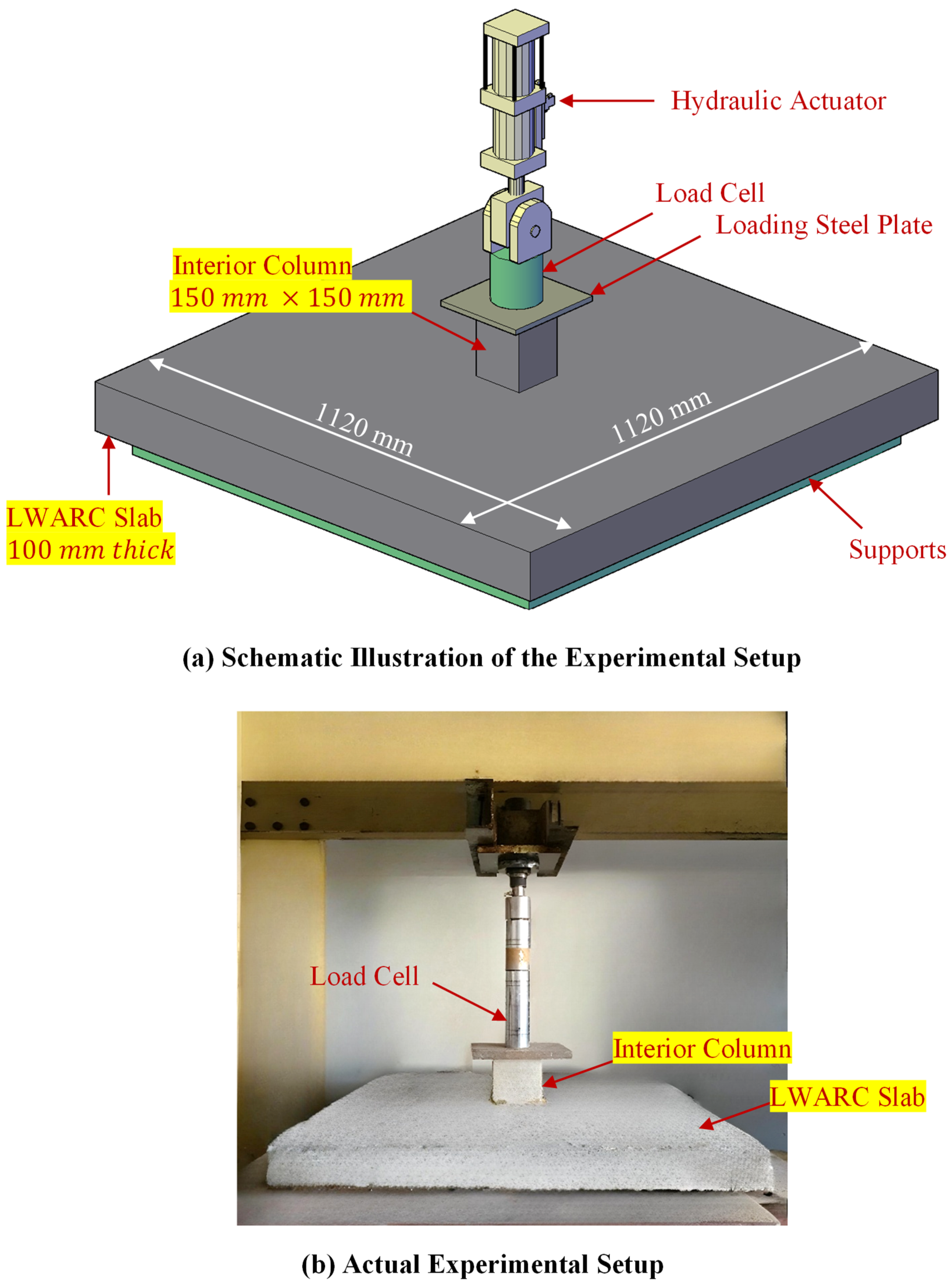 This section outlines the experimental program used to assess the punching shear behavior of LWARC slabs strengthened with FRP and steel reinforcement. It includes the material properties, the test matrix, and the loading setup used for concentric testing.