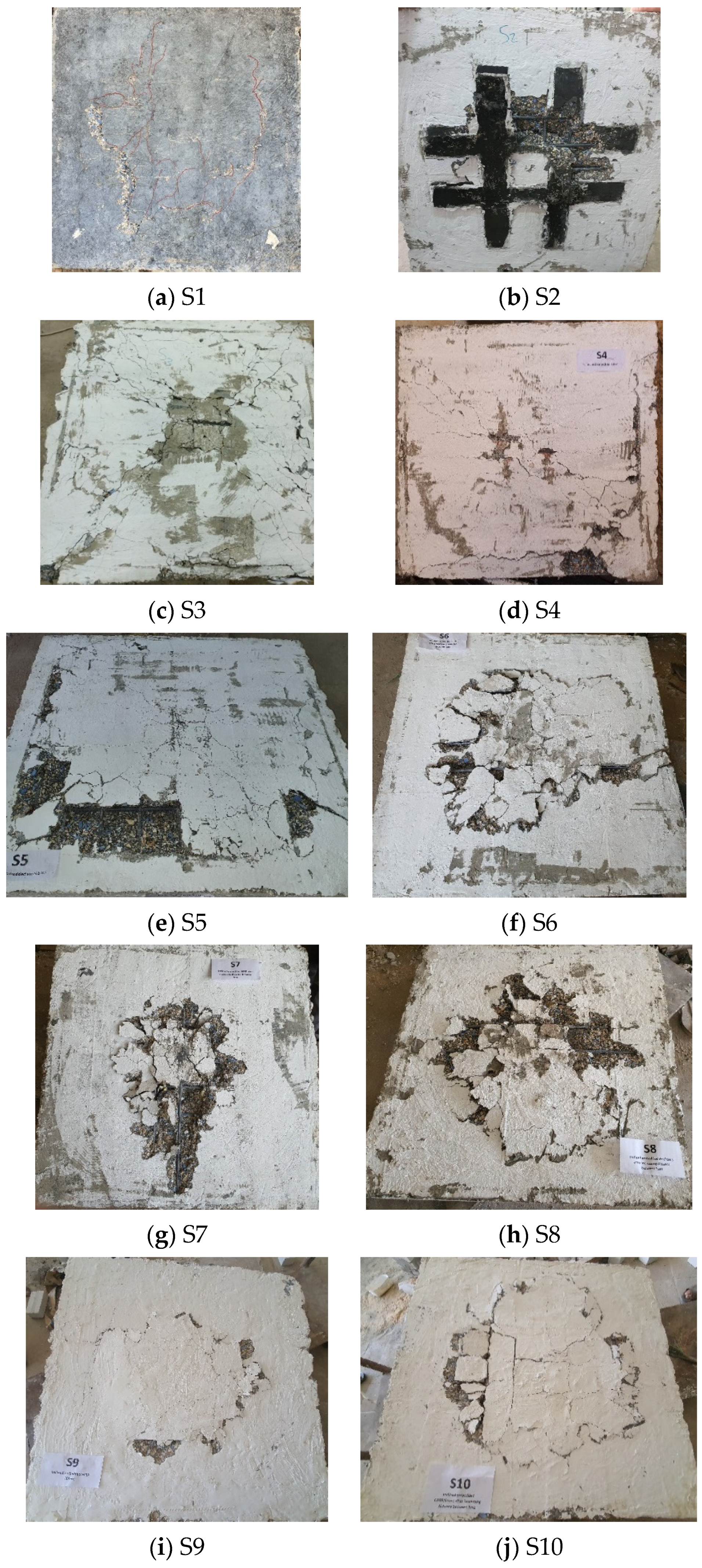 Table 2. The holes were created using a rotary drilling machine with diameters slightly larger (by 2 mm) than the bar diameter to facilitate epoxy injection and bar insertion. After cleaning the holes of debris and dust with compressed air, a two-component structural epoxy resin was injected to ensure full bonding along the drilled length. GFRP or steel bars were then inserted into the holes to the full slab depth and anchored at both the top and bottom surfaces with additional epoxy capping to prevent slippage. The orientation of the ETS reinforcement (vertical or inclined at 45°) was carefully controlled using pre-marked templates to maintain accurate alignment.