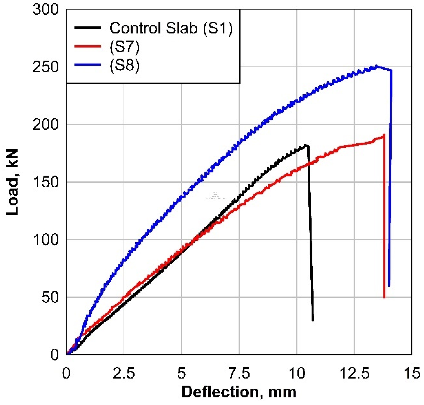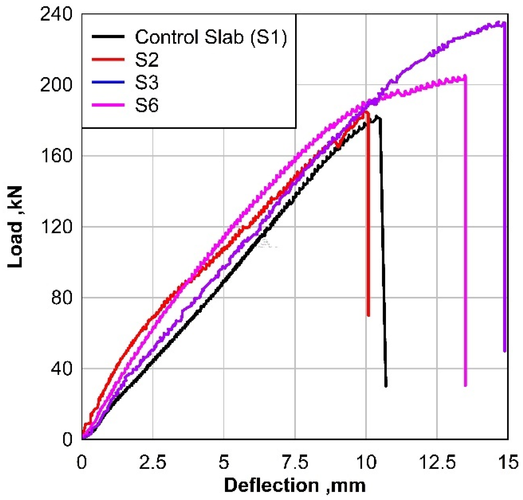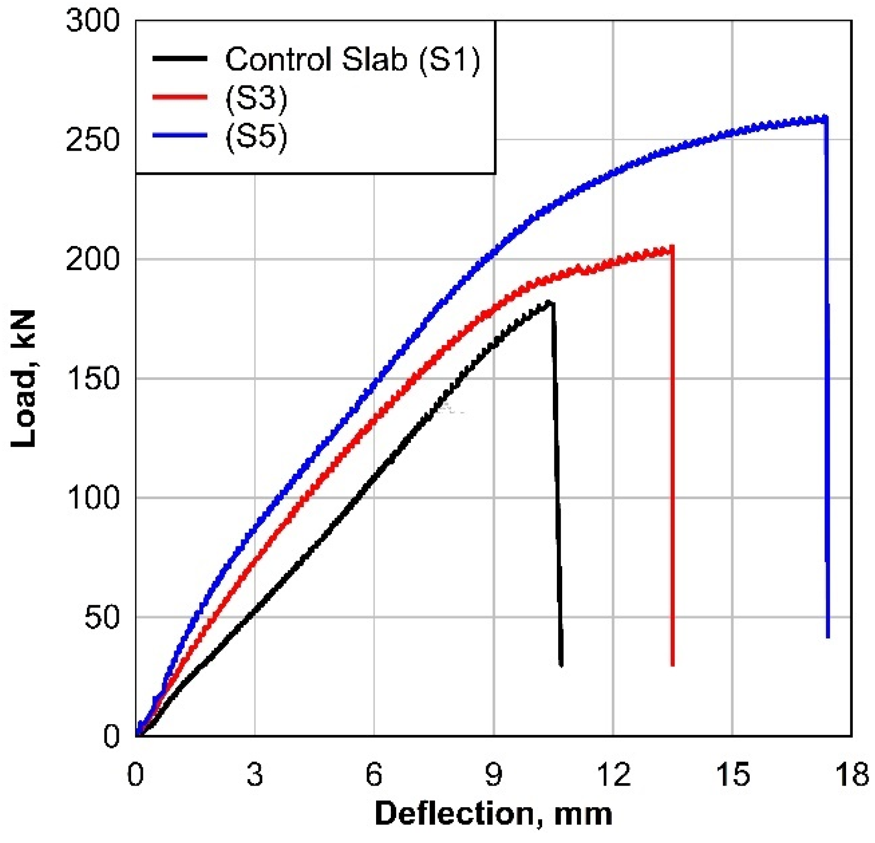 Table 3 summarizes the ultimate failure loads and corresponding percentage increases relative to the control slab (S1) for all tested specimens.