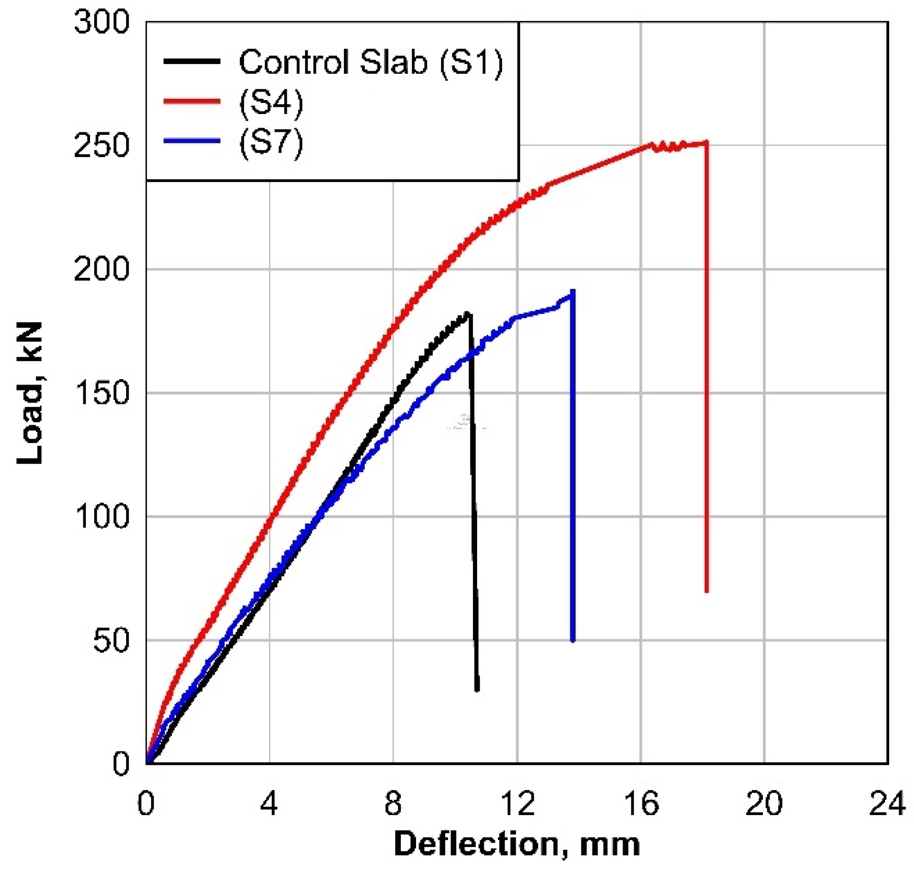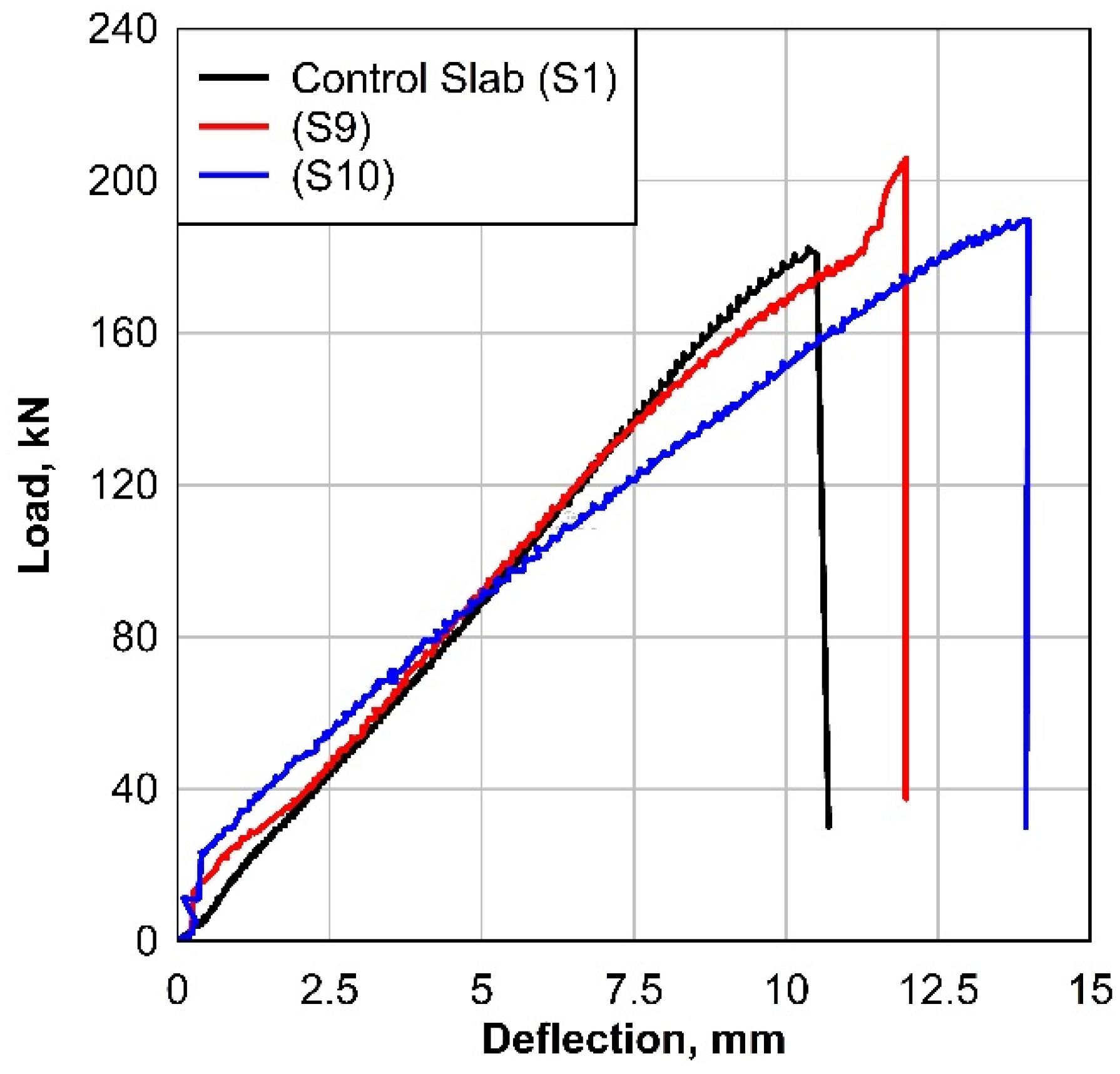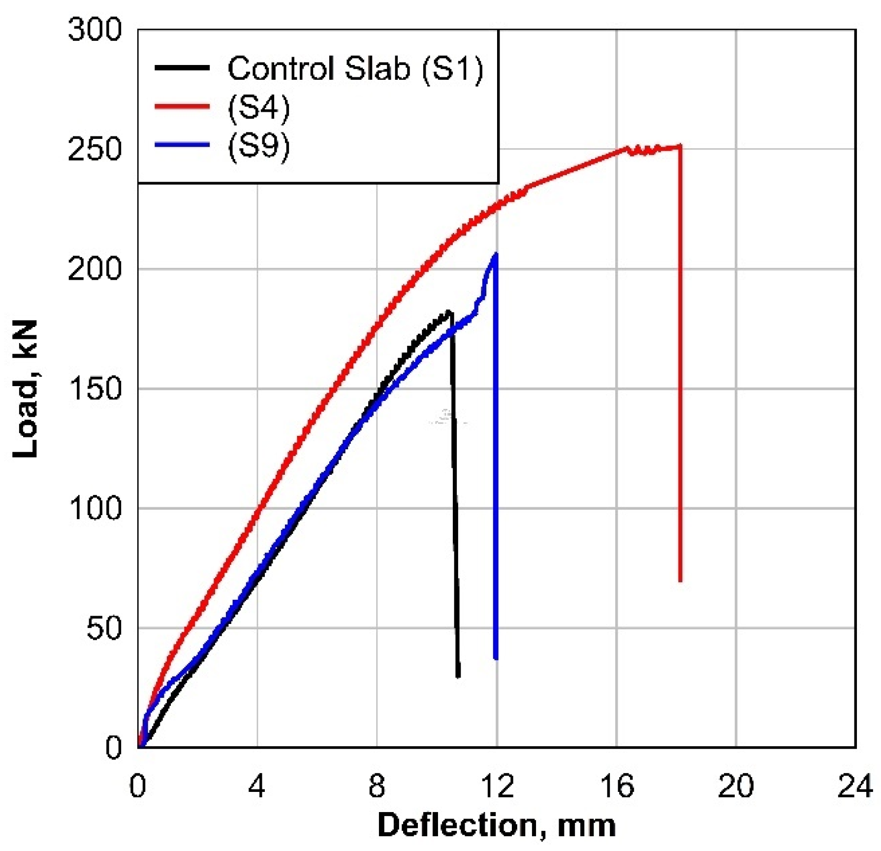 Table 3 summarizes the ultimate failure loads and corresponding percentage increases relative to the control slab (S1) for all tested specimens.
