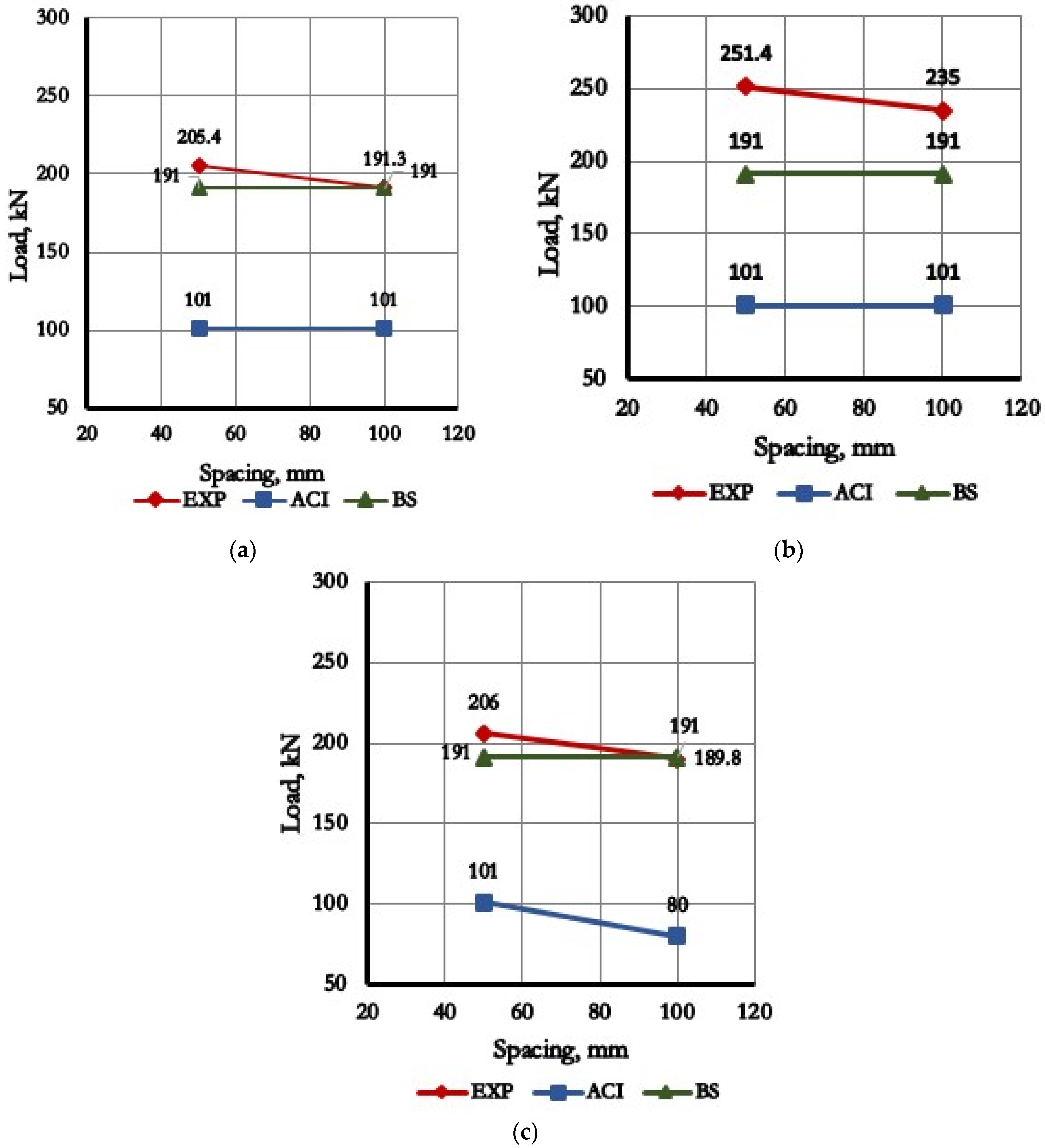 Figure 14a, experimental values were consistently higher than both ACI 318 and BS 8110 predictions, with experimental-to-code ratios improving as spacing decreased.