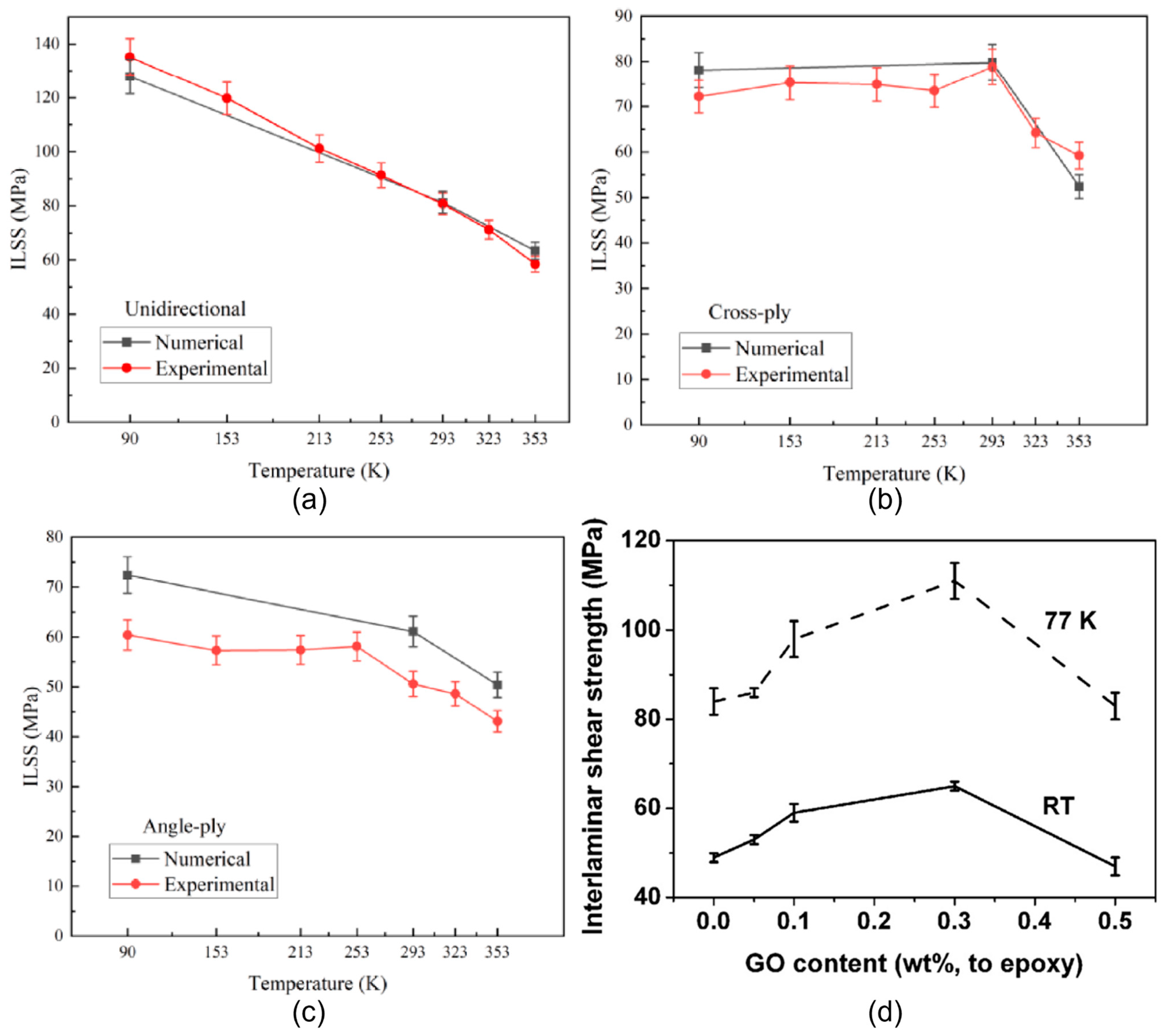 | GO nanosheets (0.25 wt%) | Epoxy/CFRP | 77 | ILSS ↑15.63% (RT); Recovery after cryo-cycling | Oxygen functional groups, hydrogen bonding [37] |