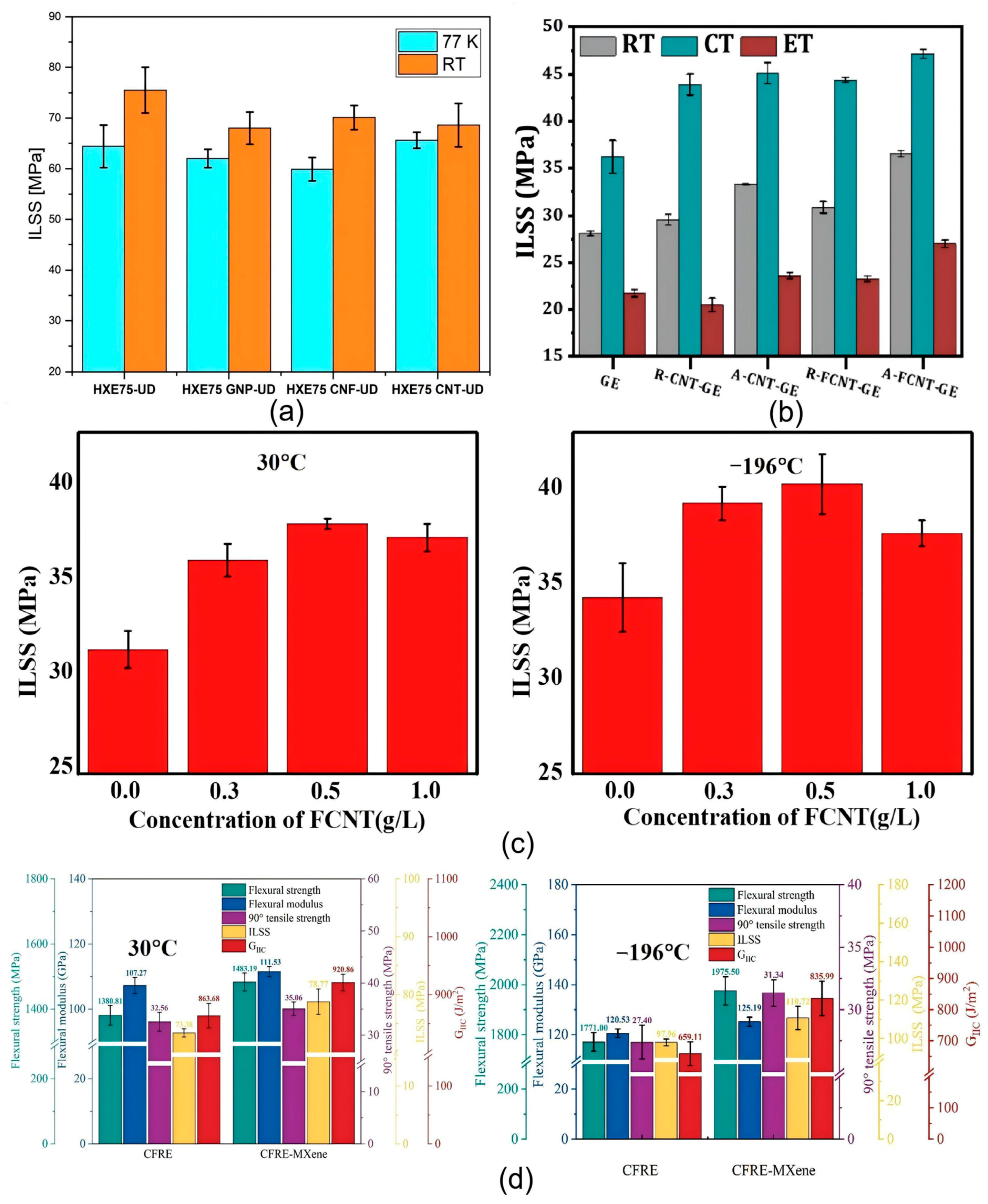 | G-COOH functionalized GN (1.5 g/L) | Epoxy/CFRP | 77 | ILSS ↑20.78%; FS ↑5.35% | Negative CTE, interfacial clamping [112] |