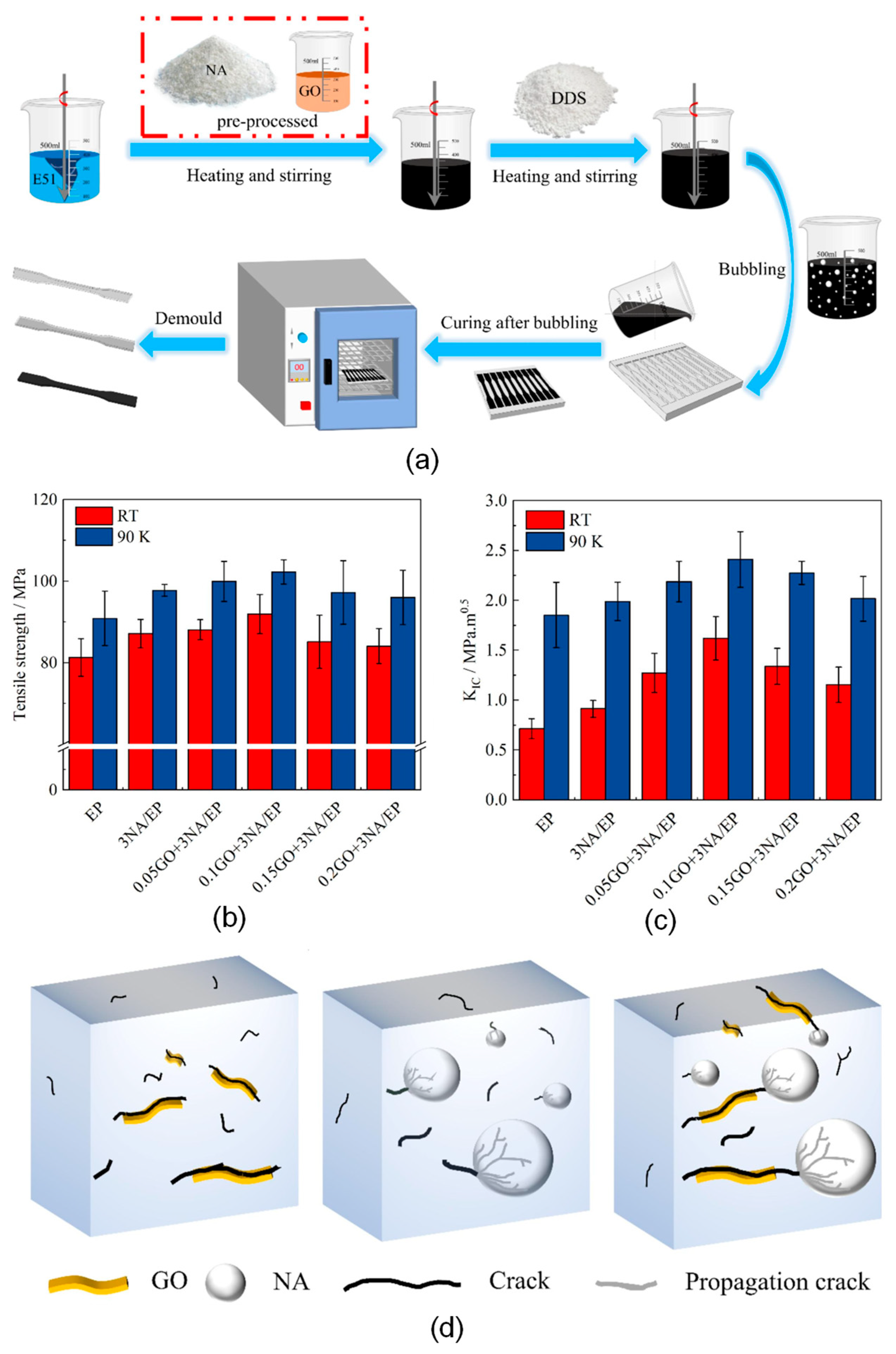 | Epoxy/GO/nano-Al(OH)3 | 0.1 wt% GO + 3 phr NA | 90 | Fracture toughness ↑30.27%; Liquid oxygen (LOX) compatibility ↑ | GO crack-path tortuosity + NA crack refinement [40] |