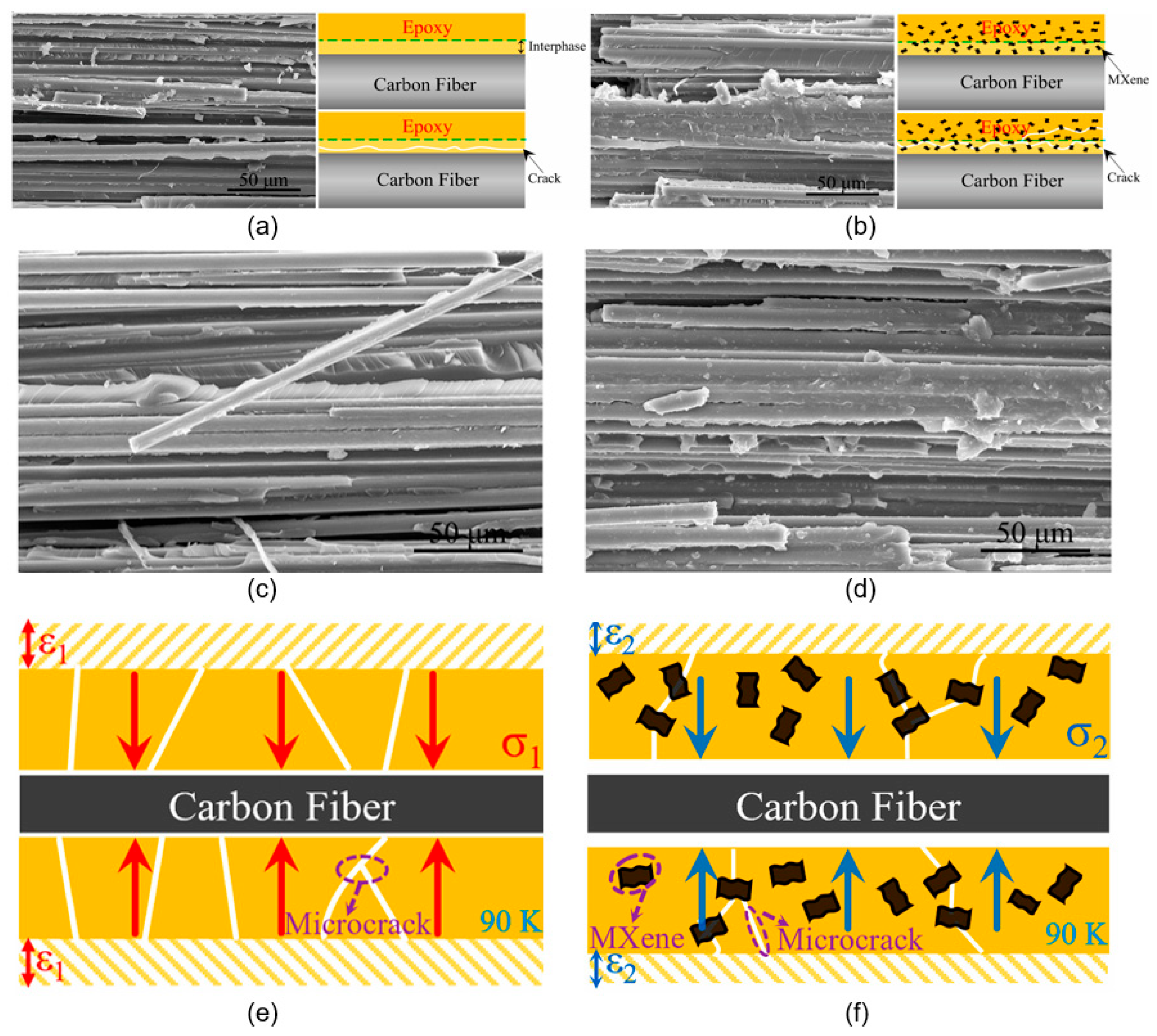 | MXene nanosheets (0.1 wt%) | Epoxy/CFRP | 90 | Crack propagation ↓3.2×; Peel stress ↓40% | Orthotropic alignment, CTE reduction [21] |