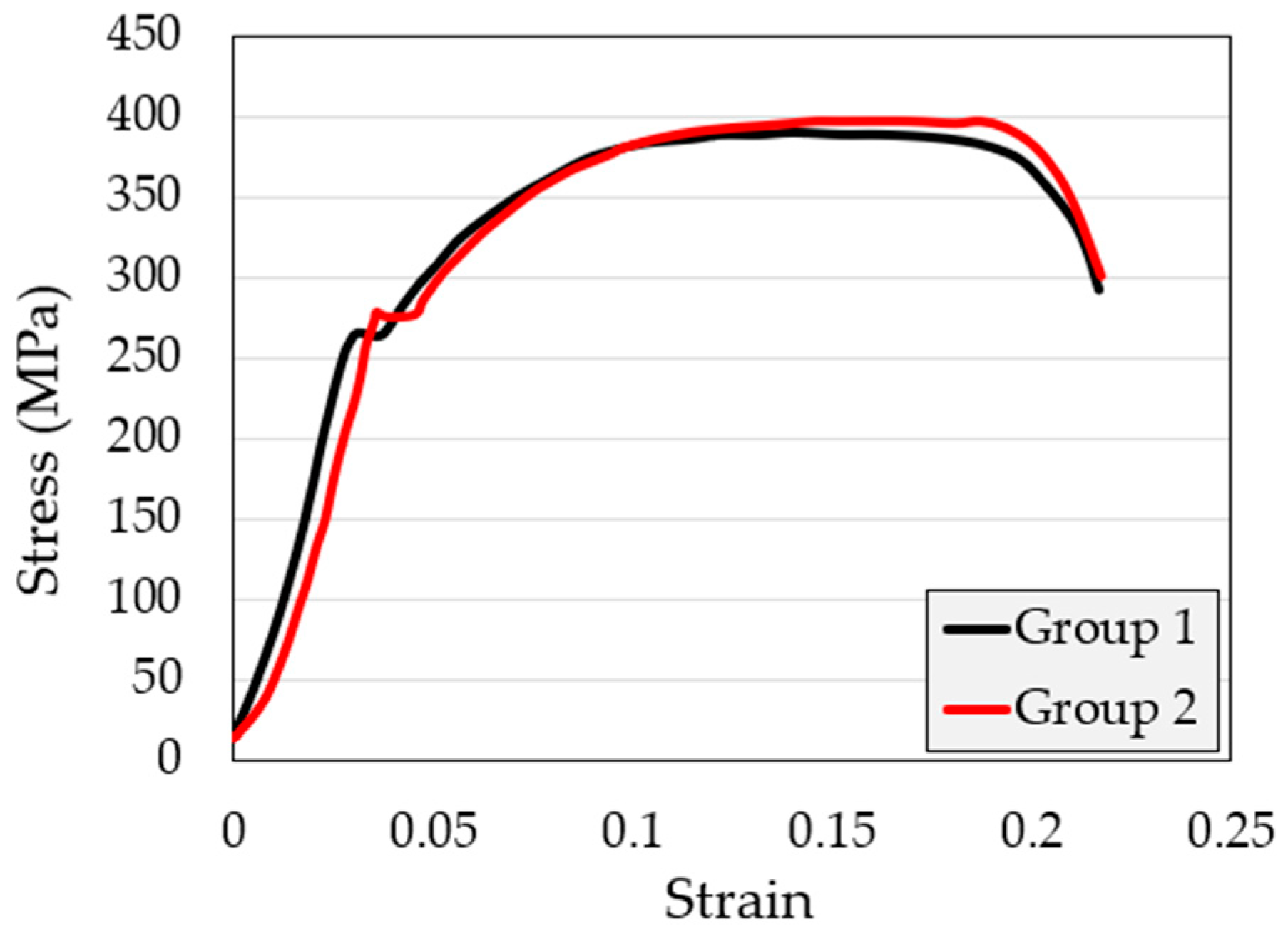 | Group | Yield Strength (MPa) | Ultimate Strength (MPa) | Yield Strain | Ultimate Strength |