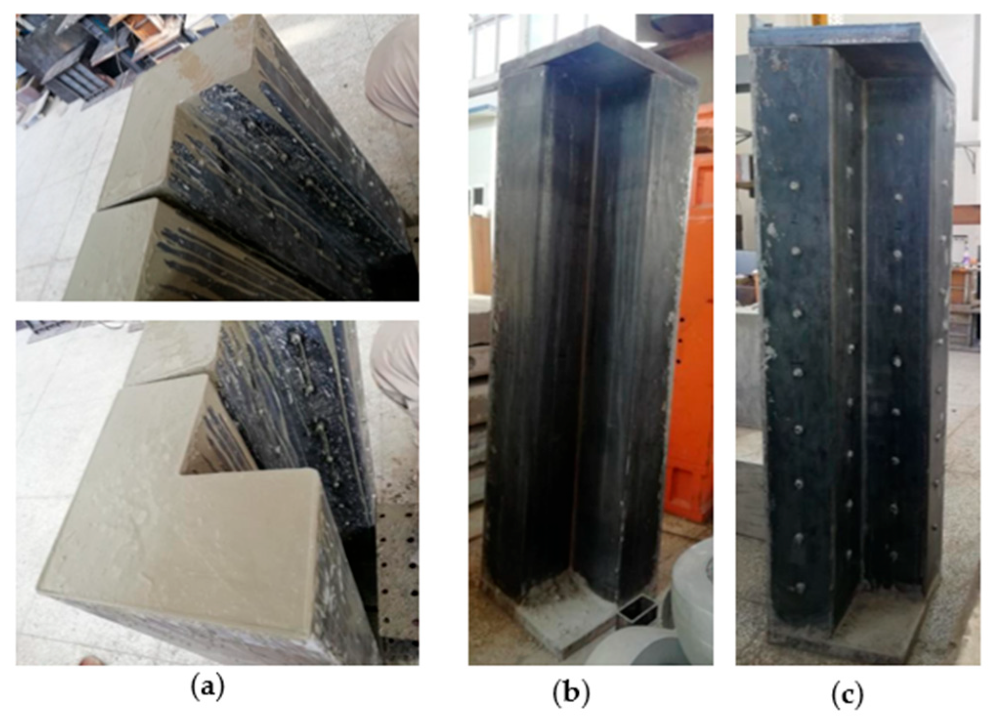 - Wang, E.; Lyu, F.; Ding, F.; Chen, J.; Liu, X. Mechanical Behavior of Stirrup-enhanced Improved Welded Concrete Filled L-shaped Steel Tubular Stub Columns under Axial Compression. KSCE J. Civ. Eng. 2024, 28, 5017–5032. [Google Scholar] [CrossRef]