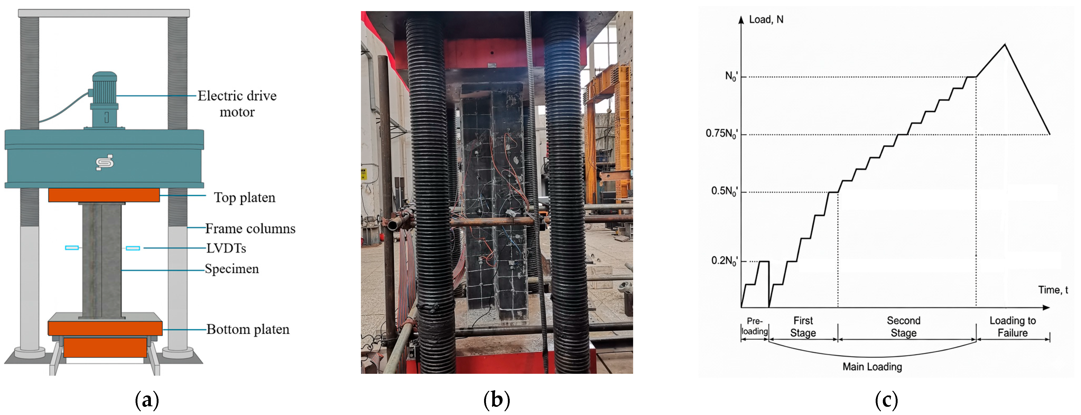 - Stage II (0.5 N0–0.75 N0): Upon reaching 0.5 N0, the load increment was reduced to 0.05 N0, and the loading rate was set to 3 kN/s. The holding time at each level was extended to 5 min to closely monitor the behavior as the load approached a target design axial compression ratio of 0.75.