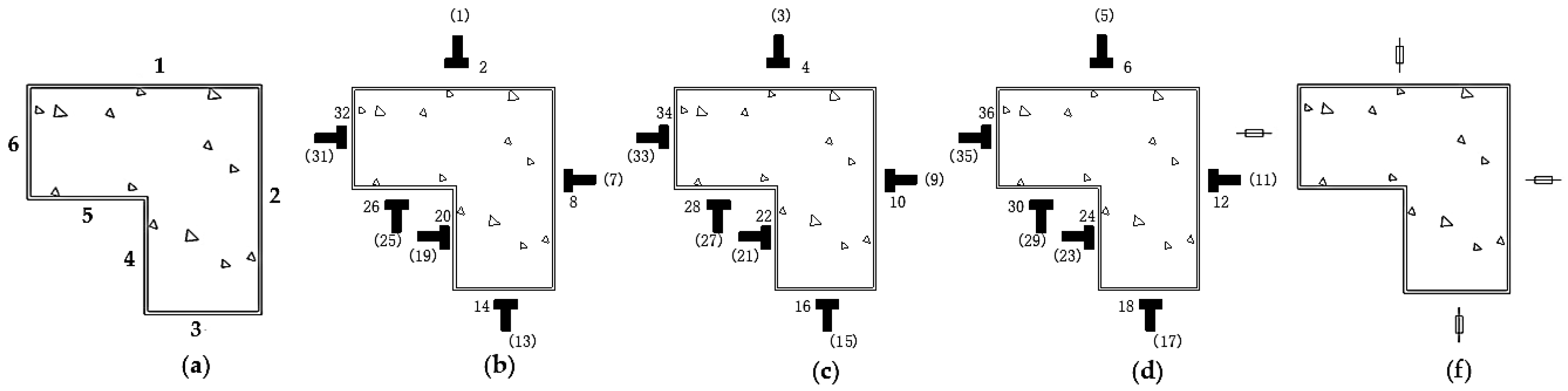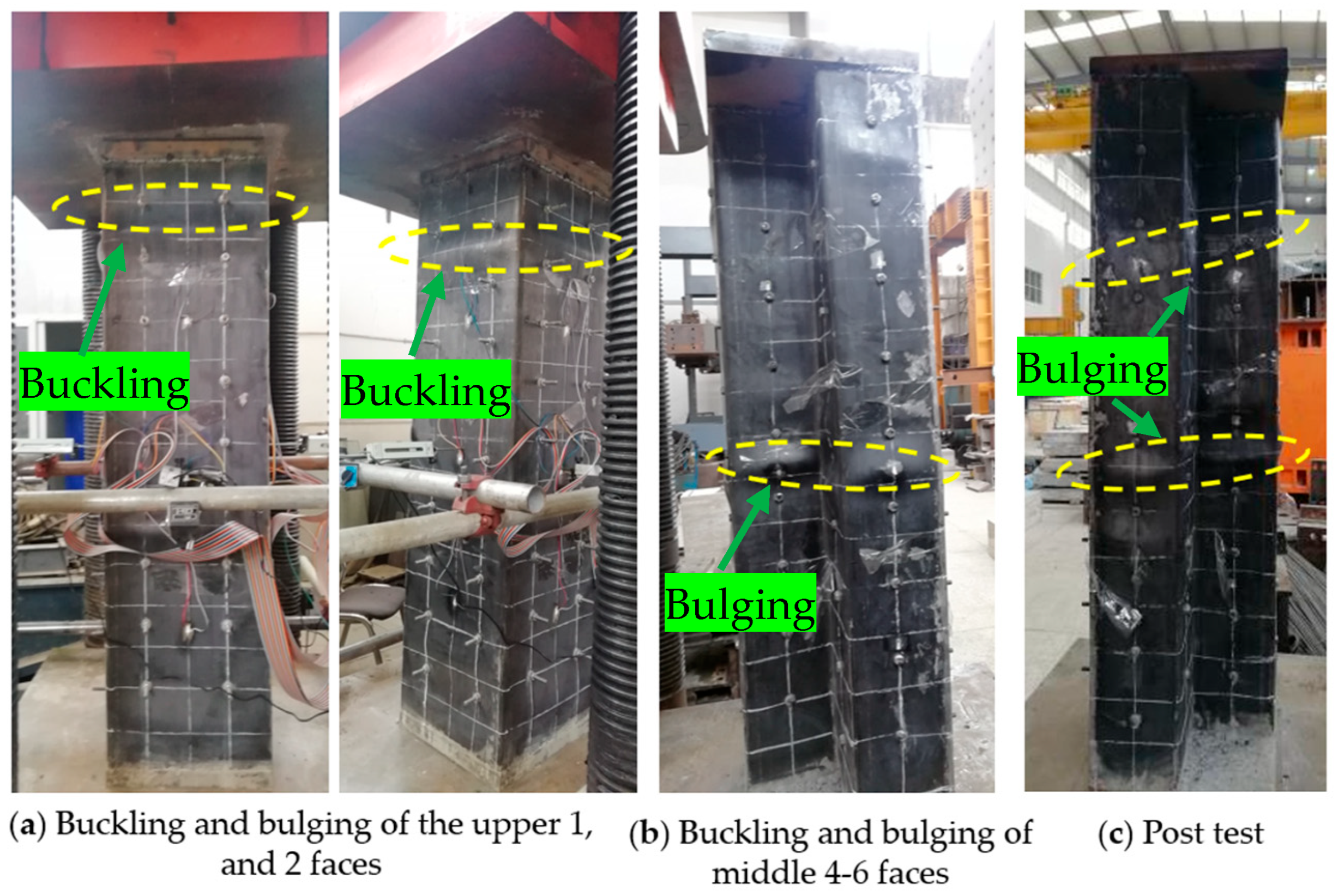 - Lateral displacement measurement: Four YHD-100 type displacement transducers (LVDTs) were mounted at the mid-height of the column to measure out-of-plane lateral displacements, which are indicative of the initiation and progression of local buckling. The positions of the LVDTs on faces 1, 2, 3, and 6 are shown in Figure 9f.