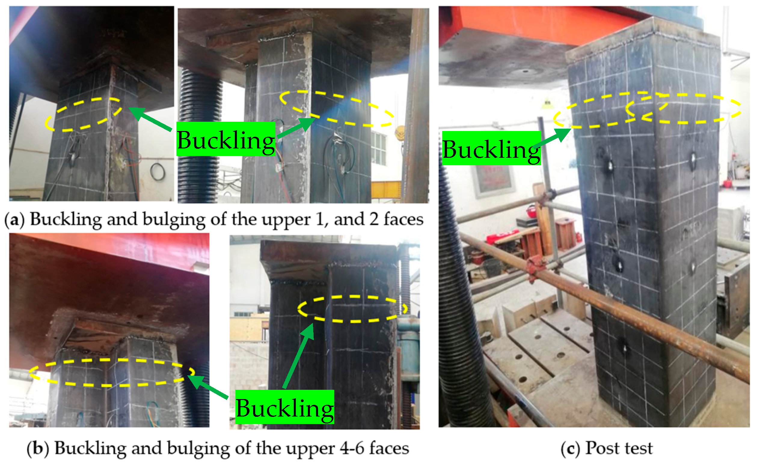 - Both specimens exhibited a local buckling-led response under monotonic axial compression, characterized by the outward bulging of the steel tube plates driven by concrete core dilation. The RT system did not change the governing limit state category; rather, it re-governed the progression by delaying early localization and reshaping the instability trajectory.