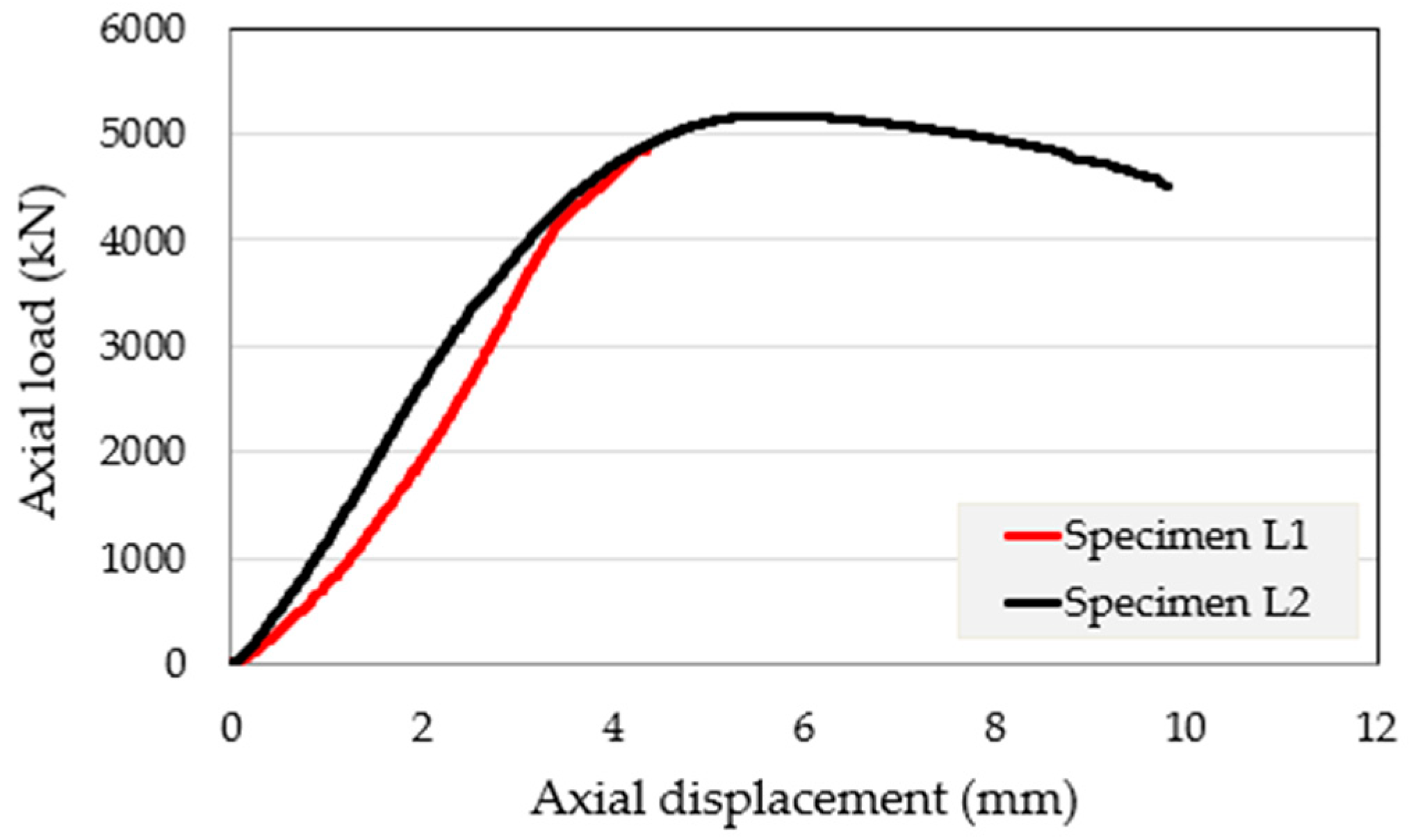 - The RT detailing delivered a measurable peak-load uplift from 4354 kN (L1) to 5354 kN (L2), that is, +1000 kN (~23%), without changing the primary section dimensions. The load associated with the first visually observed local bulging/buckling increased more modestly from ~3350 to ~3600 kN (≈7–8%). This confirms that the primary value of the RT system is realized in peak capacity and response-path stability/robustness (delayed stiffness degradation and extended efficient composite-working regime), rather than solely shifting the first visible instability trigger (which is observation-based and can lag incipient local instability).