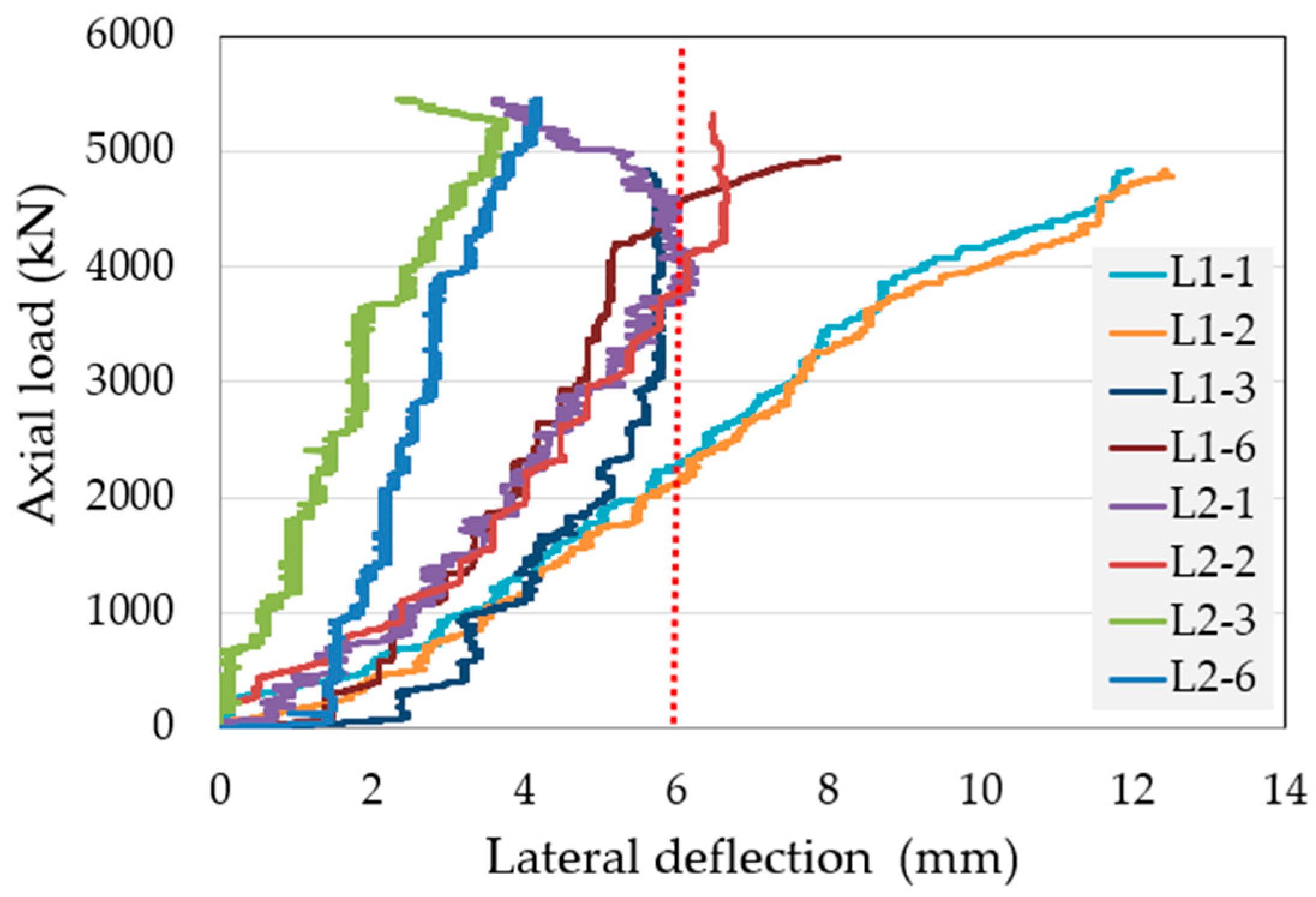 - Mid-height lateral deflection monitoring of multiple faces confirmed that the RT system provided an effective transverse restraint against outward dilation. Compared with L1, L2 maintained a tighter lateral-deflection envelope, indicating improved buckling control and more stable deformation under increasing axial demand.