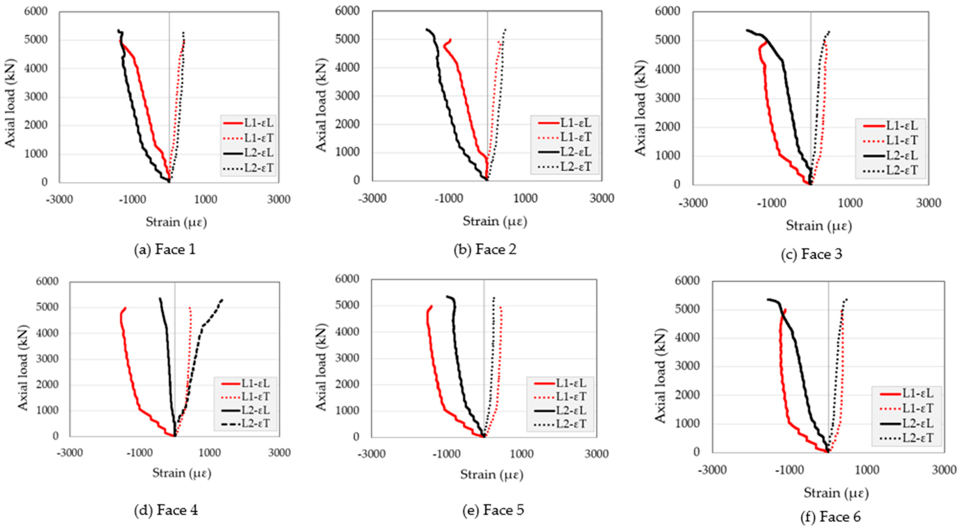 - The mid-height strain results (εL–εT) indicate that RT promotes a more managed transition into coupled axial–hoop tube action. Relative to L1, L2 exhibited reduced face-to-face dispersion and clearer mobilization of hoop strain demand at higher loads, supporting the conclusion that RT improves the confinement delivery consistency across the L-shaped perimeter.