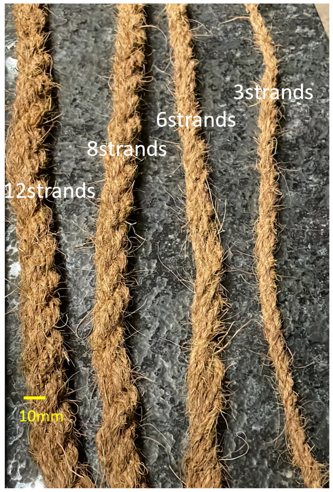 - Ali, M.; Chouw, N. Experimental investigations on coconut-fibre rope tensile strength and pullout from coconut fibre reinforced concrete. Constr. Build. Mater. 2013, 41, 681–690. [Google Scholar] [CrossRef]