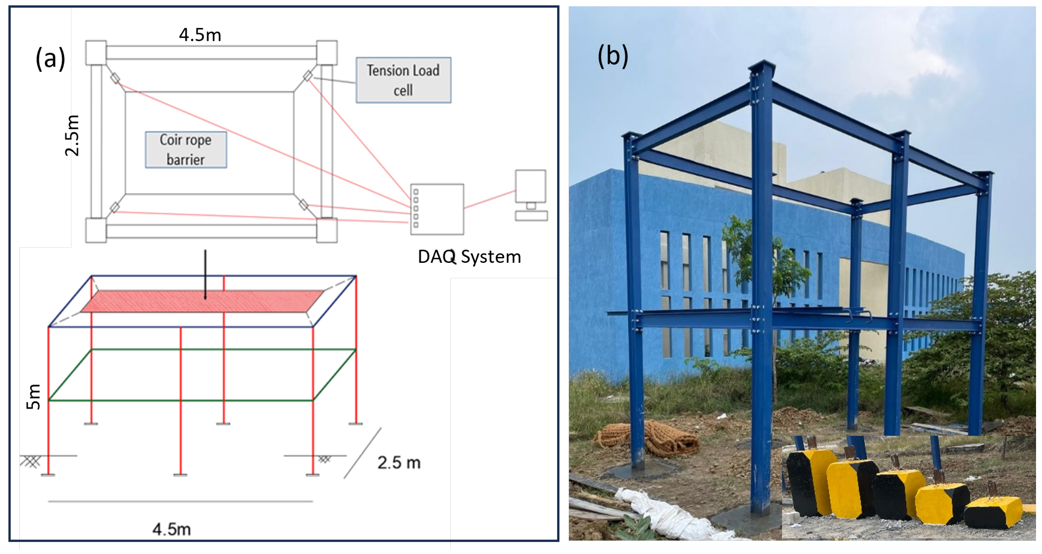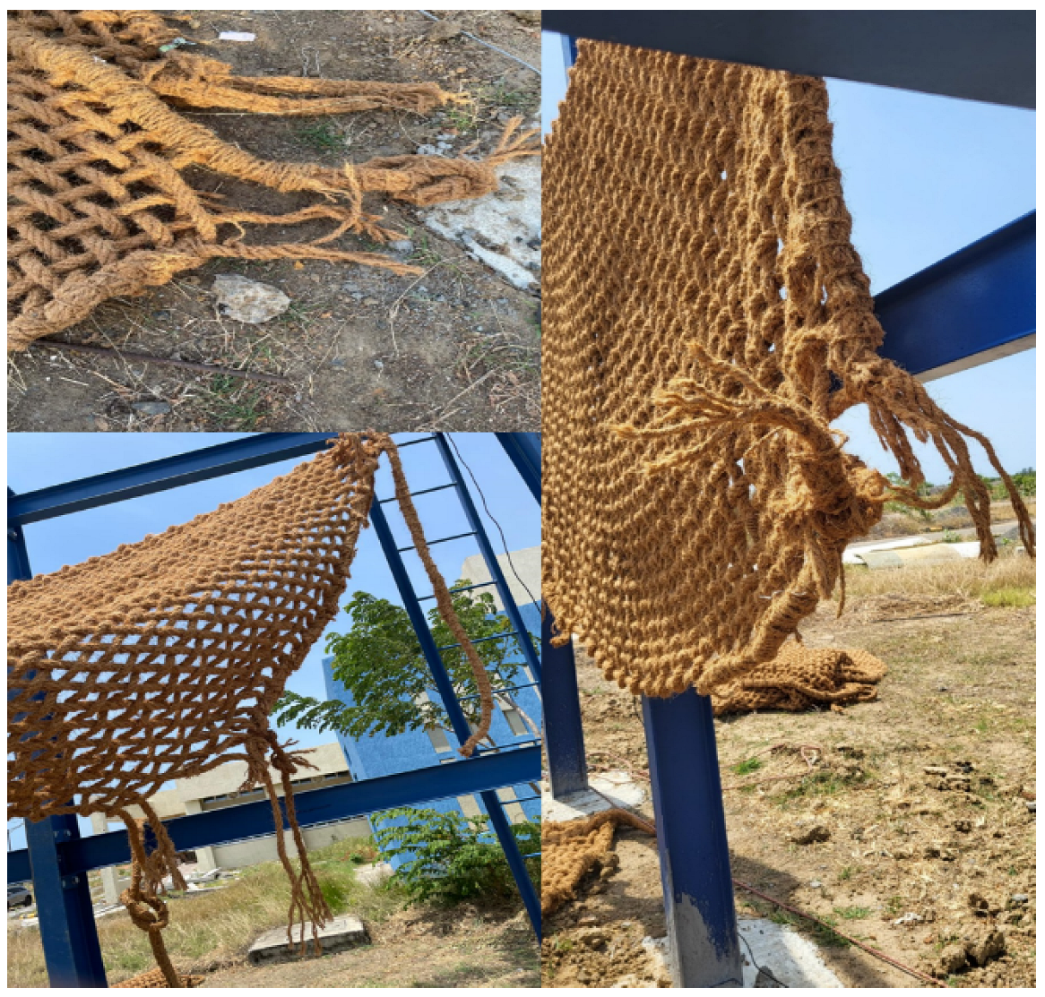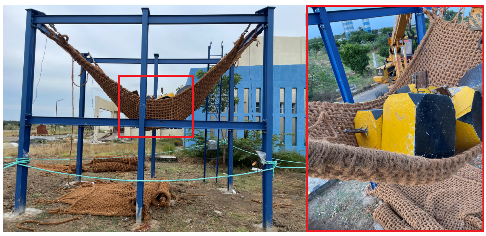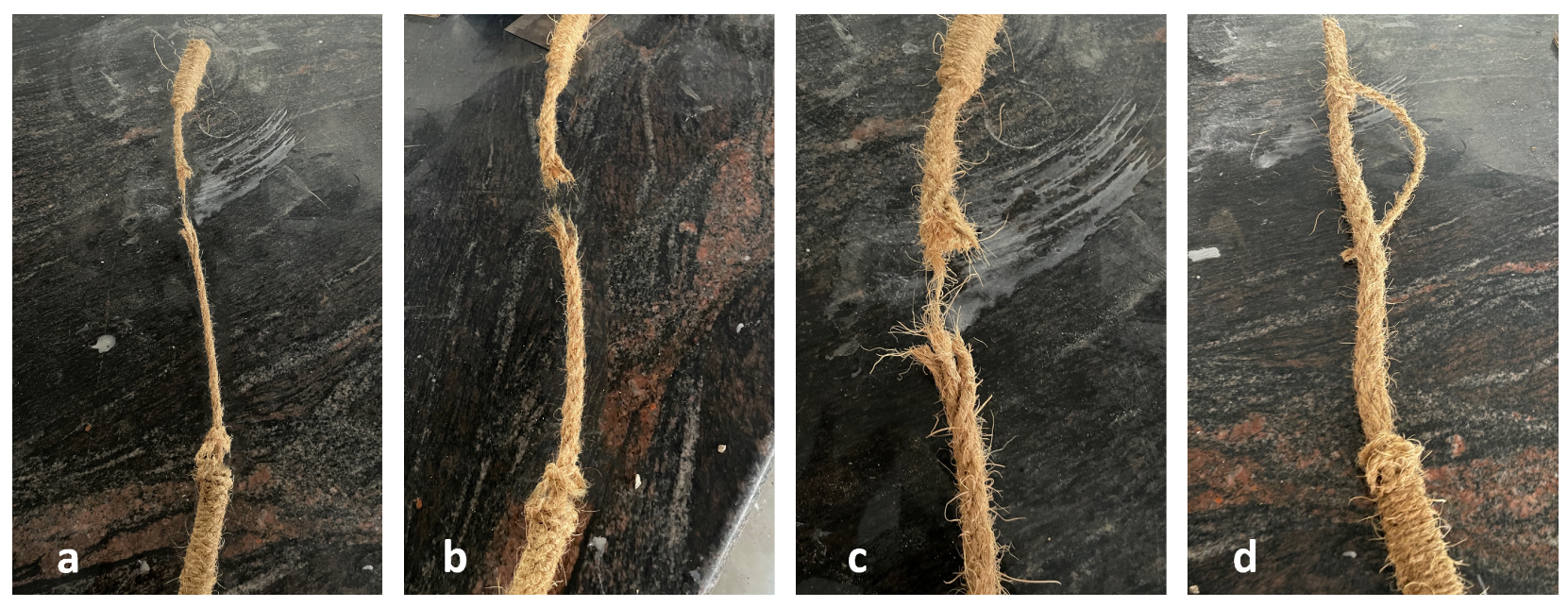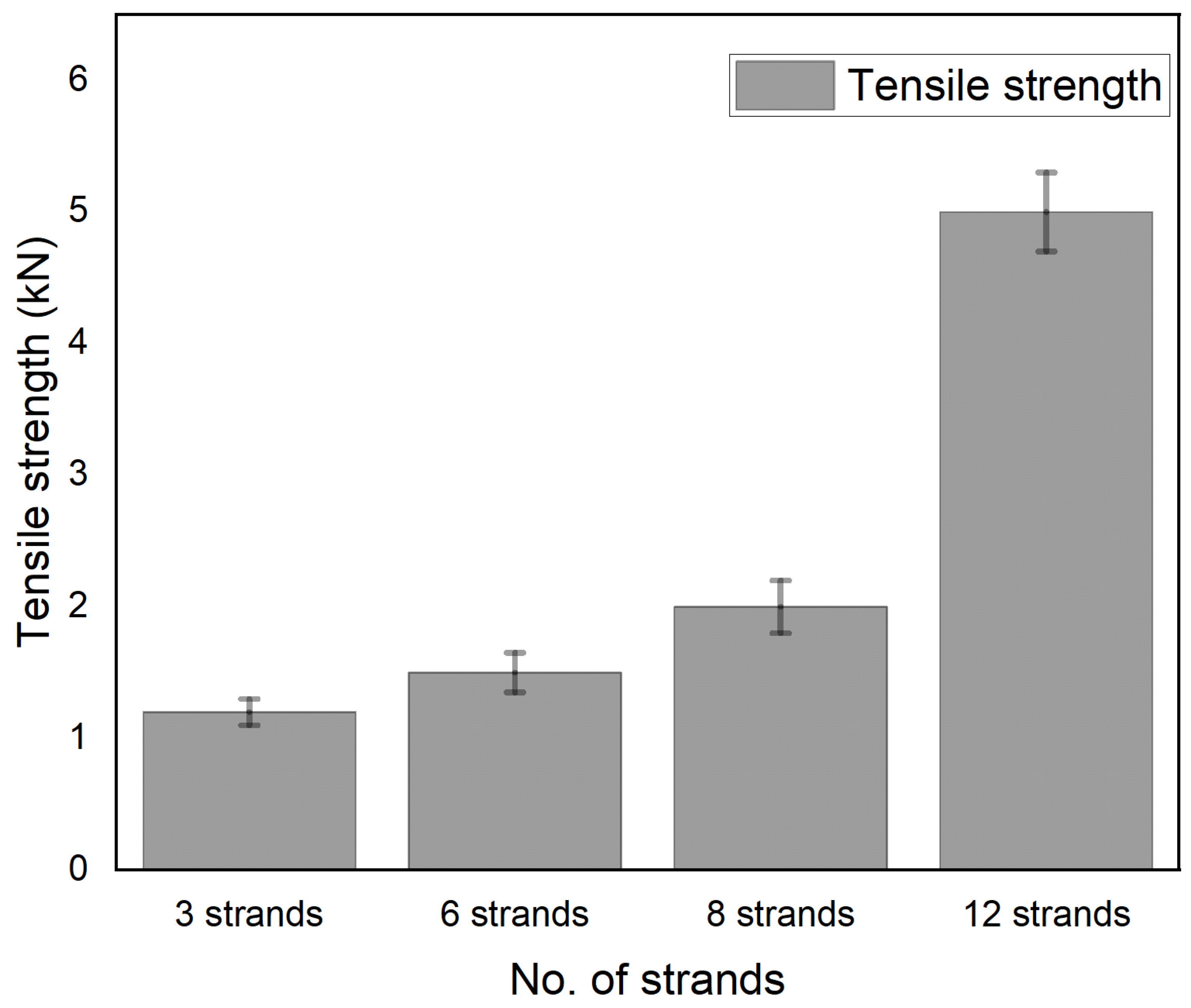 - Tensile characterization of coir ropes indicated that increasing the strand count significantly enhanced mechanical performance. The multi-strand configurations achieved tensile capacities exceeding 2 kN and exhibited large elongation values without abrupt ruptures, indicating deformation-tolerant behavior that is advantageous for flexible, energy-dissipating barrier systems.