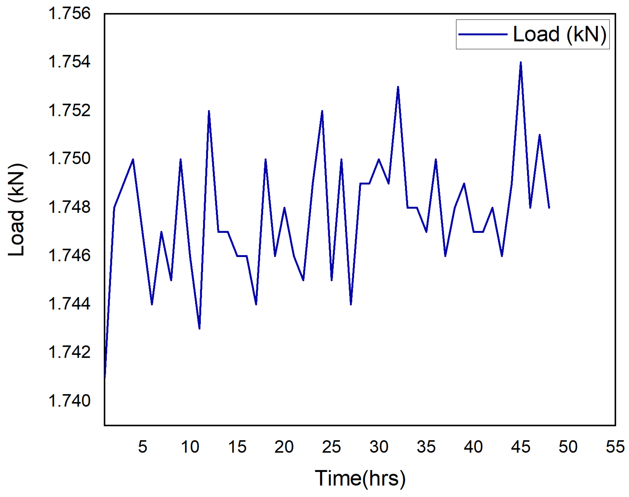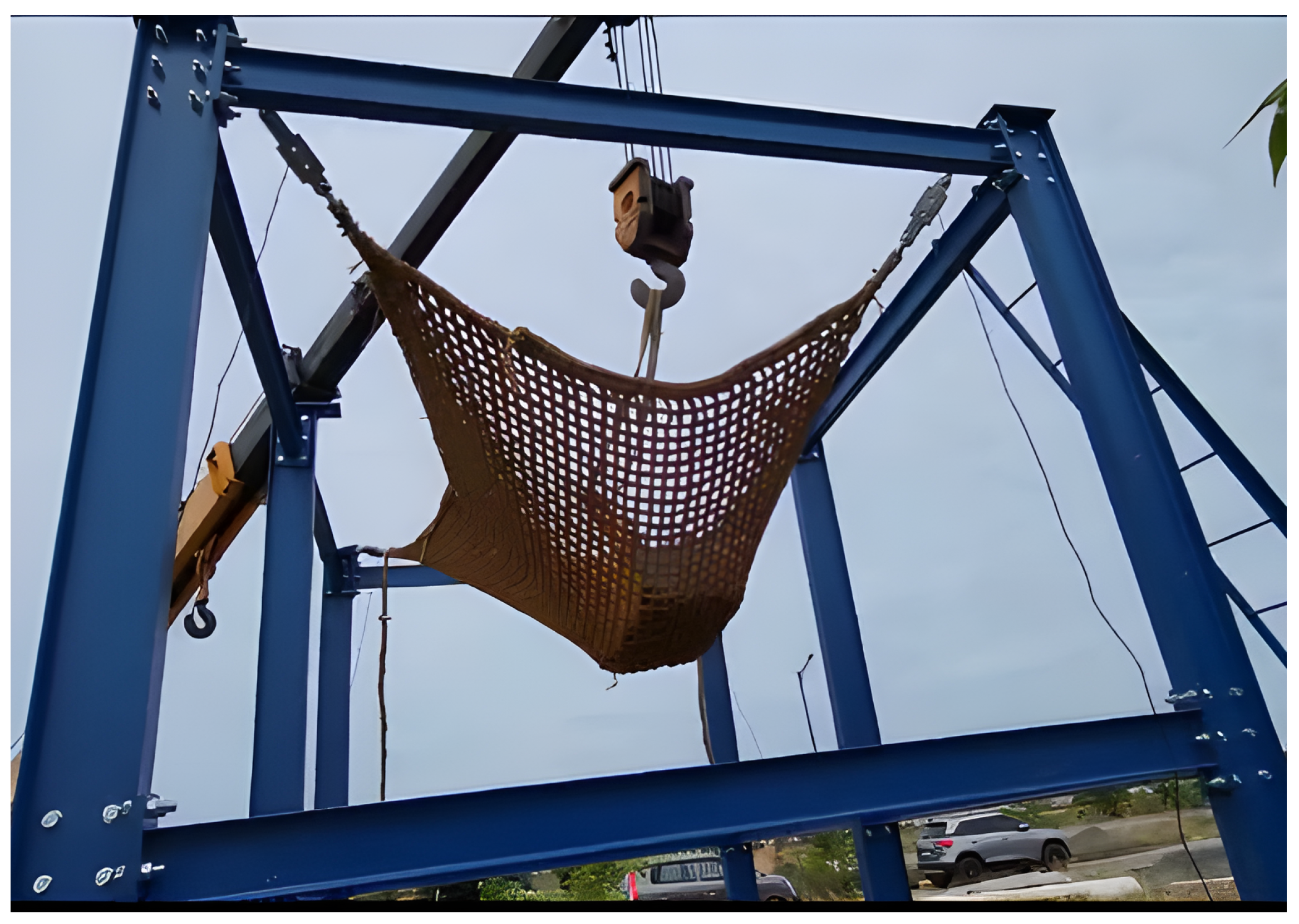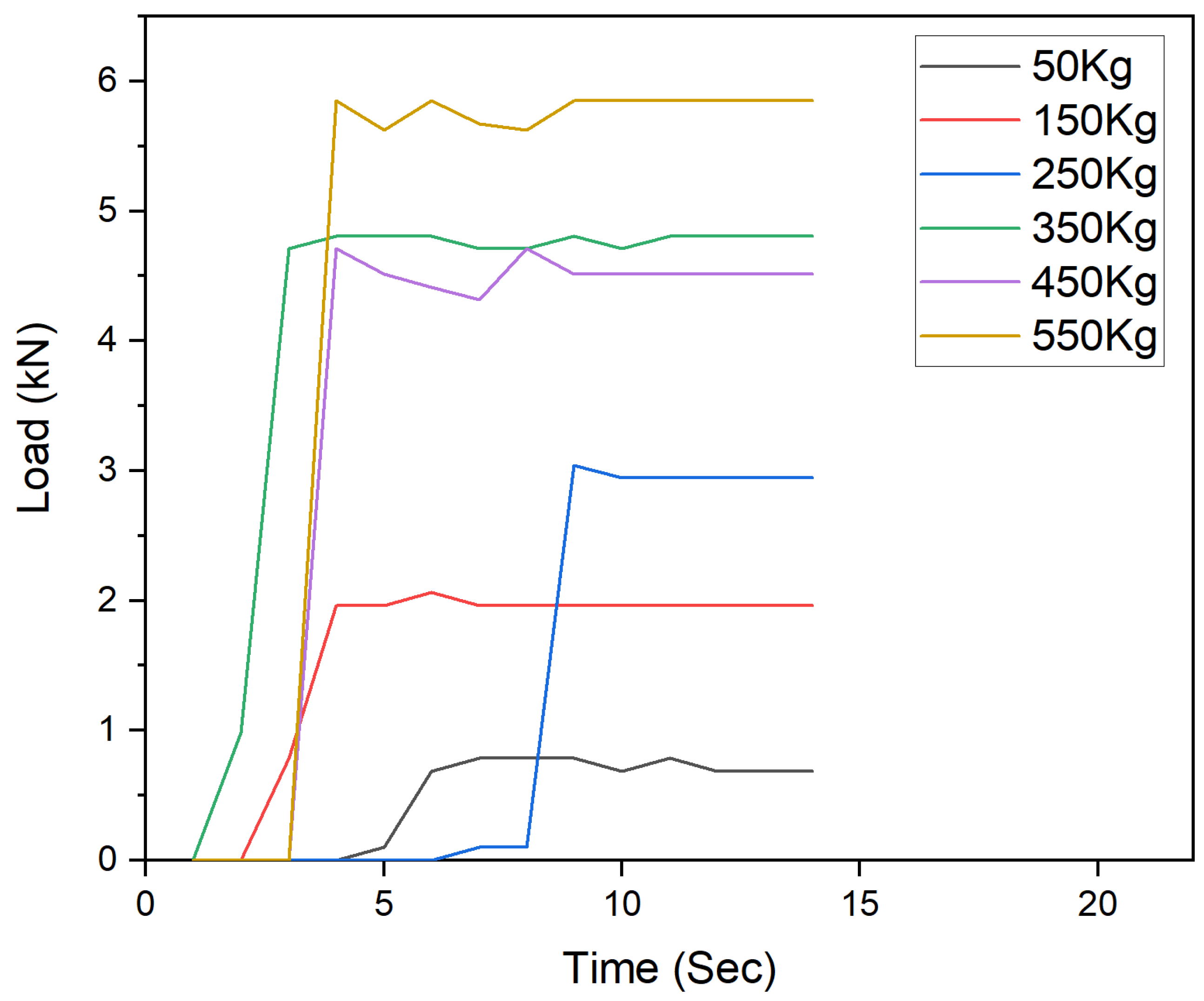 - Incremental static load tests confirmed that the developed barrier could sustain loads of up to 550 kg without rupture or loss of structural continuity. In addition, sustained loading of approximately 1700 kg was maintained over a period of 48 h with a negligible loss in load-carrying capacity, indicating satisfactory post-impact serviceability.