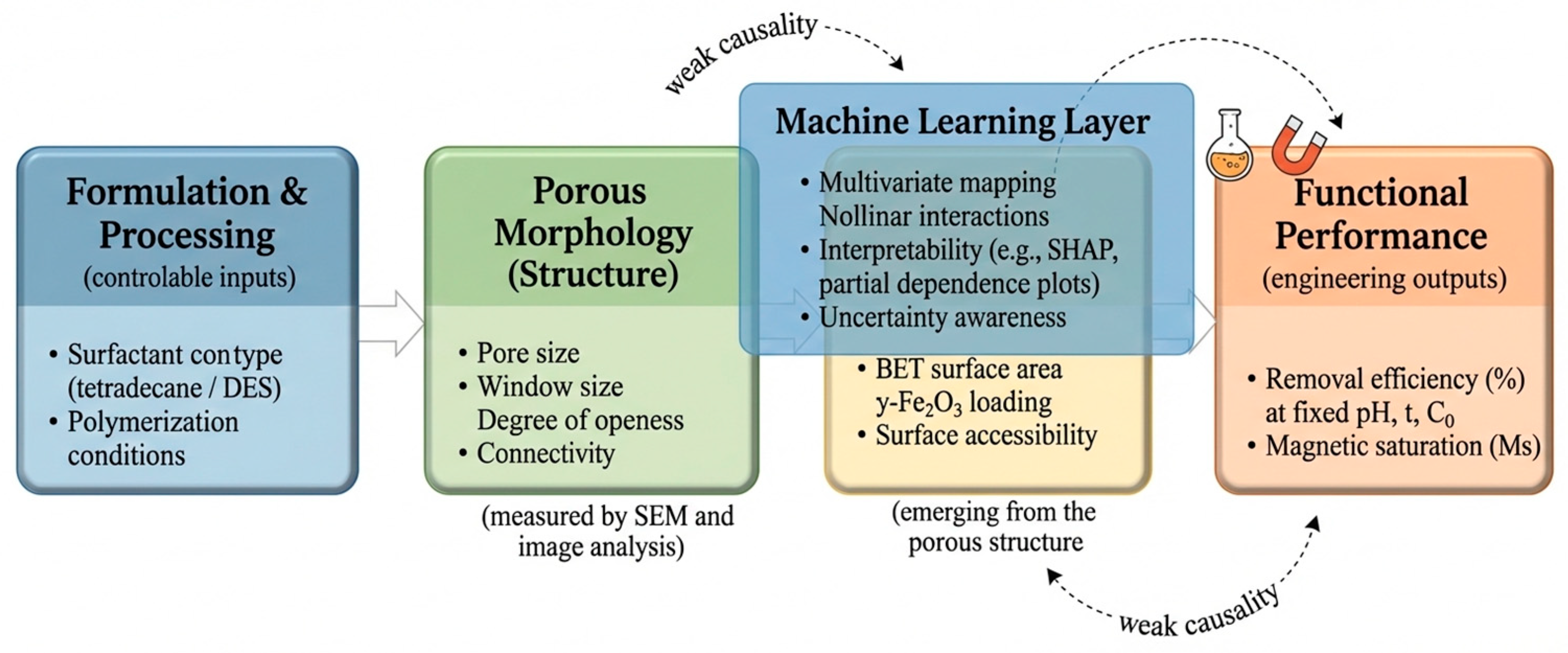 Such coupled behavior is not unique to a single formulation or study but recurs across polyHIPE-based magnetic composites reported in the literature. Nevertheless, extracting quantitative and transferable structure–property–performance relationships from these dispersed experimental datasets remains challenging. Functional performance is typically discussed through qualitative comparisons or limited parametric trends, which are insufficient to resolve nonlinear interactions or trade-offs between competing design objectives [