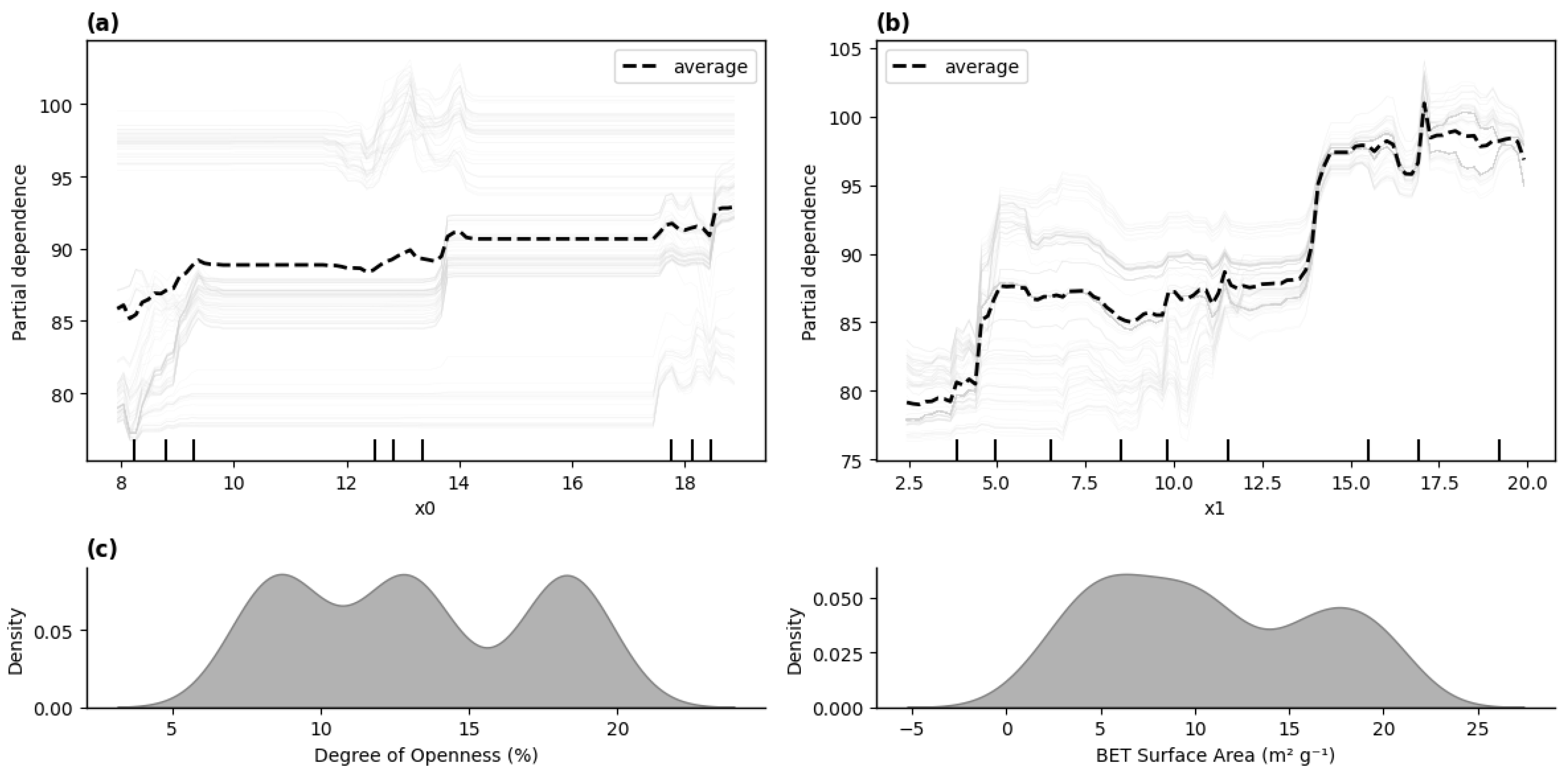 Across all nonlinear models, descriptors associated with accessible surface area and pore connectivity rank among the most influential contributors to removal efficiency. In particular, the degree of openness and BET specific surface area exhibit strong positive associations with predicted adsorption performance, underscoring the central role of transport accessibility and available adsorption sites within the macroporous network. Partial dependence analysis further reveals that these effects are intrinsically nonlinear, with diminishing returns beyond intermediate values of openness and surface area. This behavior suggests that excessive structural openness does not necessarily translate into proportional performance gains, likely reflecting trade-offs between pore accessibility, effective surface utilization, and fluid–solid contact efficiency.