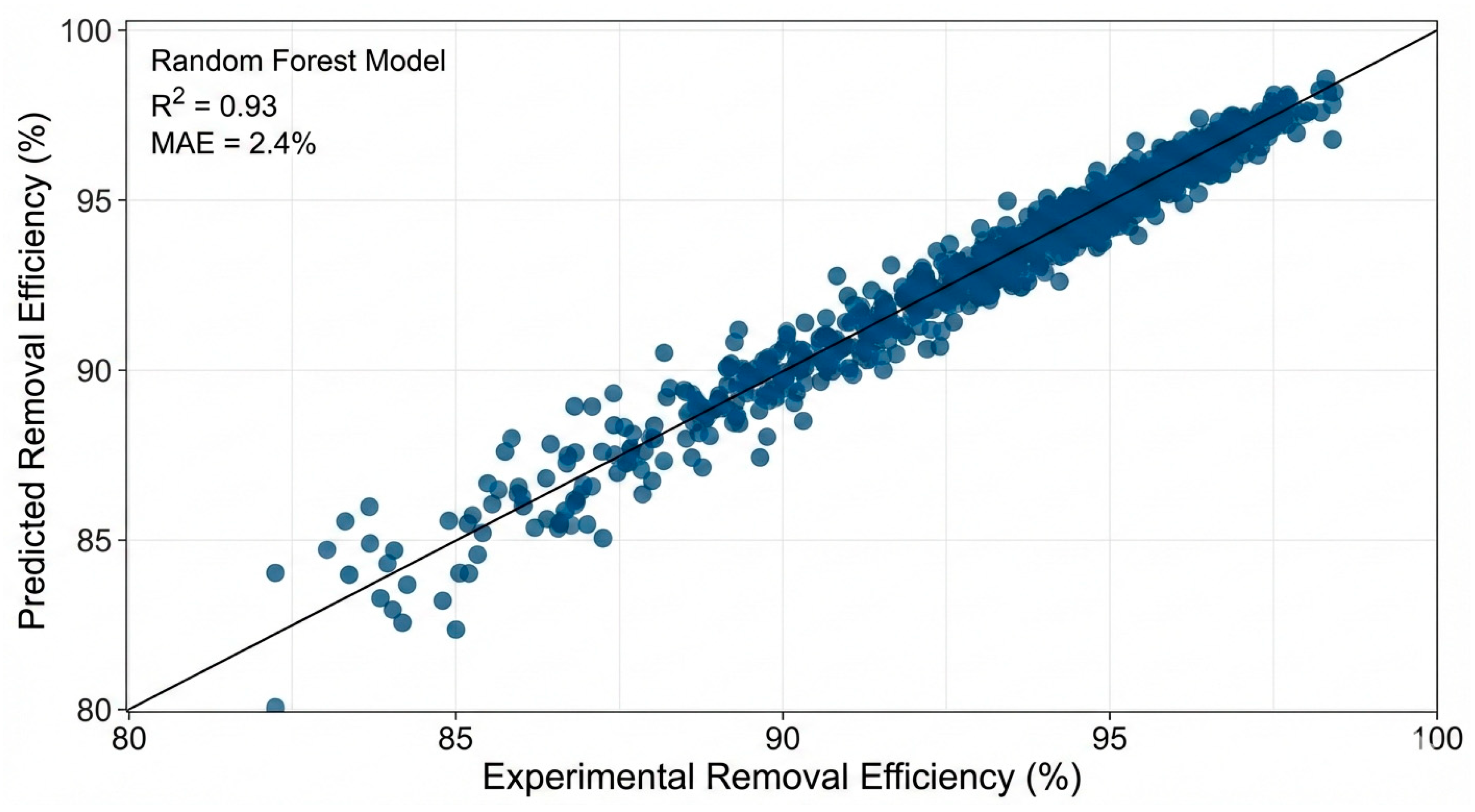 Figure 3 illustrates the strong agreement between experimental removal efficiency values and predictions generated by the optimized Random Forest model. Data points cluster tightly around the line of identity (y = x), visually corroborating the high cross-validated coefficient of determination (R