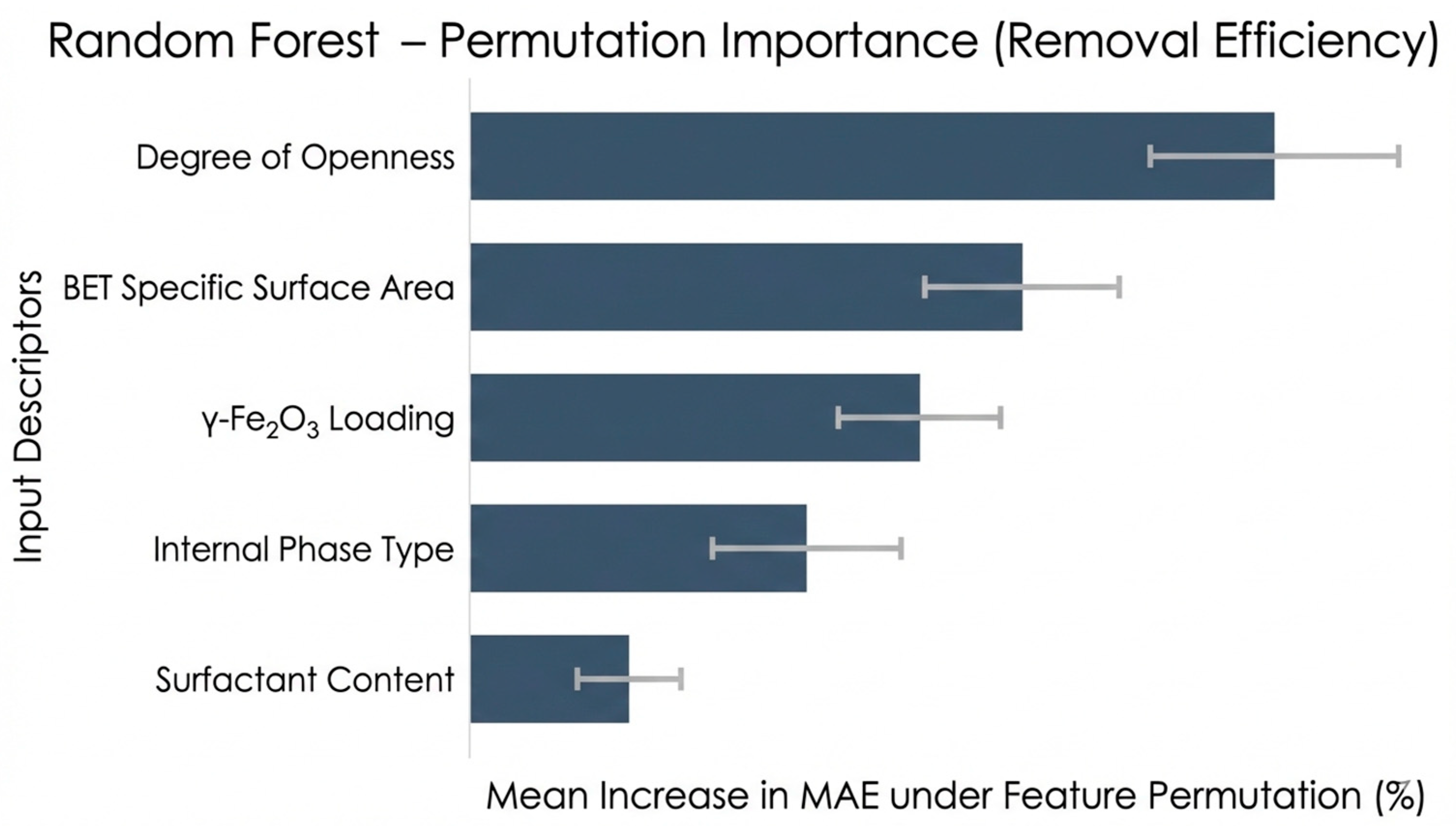 To translate the high predictive accuracy of the Random Forest model into actionable design insight, the global contribution of each input descriptor to the prediction of removal efficiency was quantified using permutation importance. This approach evaluates feature relevance by randomly permuting the values of a given descriptor and measuring the resulting degradation in model performance, thereby providing a robust, model-agnostic estimate of its influence that explicitly accounts for nonlinear interactions among variables.