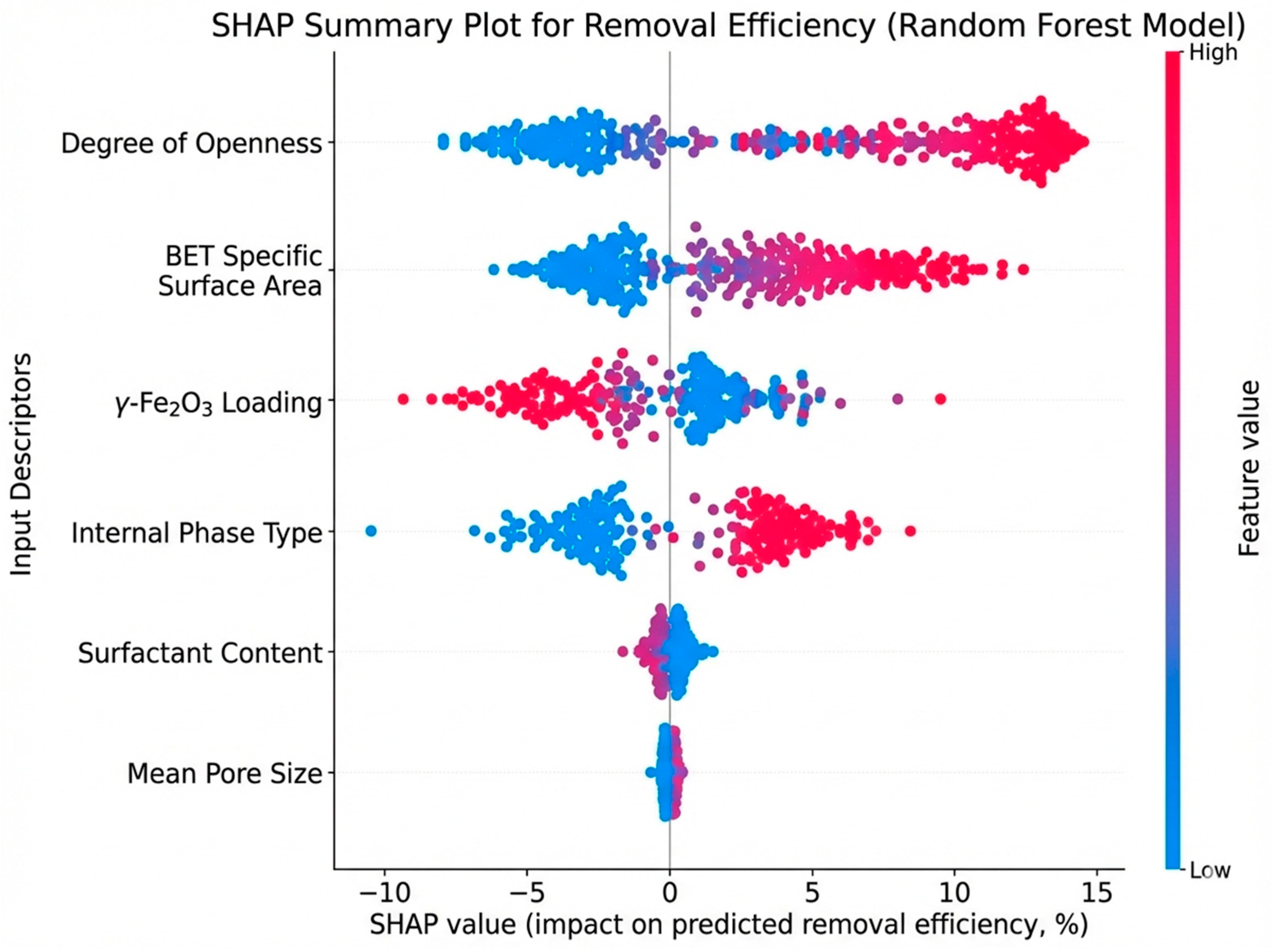 Taken together, the SHAP analysis extends beyond simple correlation by revealing descriptor-specific regimes and trade-offs that are directly relevant to engineering design. In particular, it identifies an effective upper bound for γ-Fe2O3 loading and further underscores the primacy of structural openness and surface accessibility as key optimization targets for macroporous polyHIPE-based magnetic polymer composites.