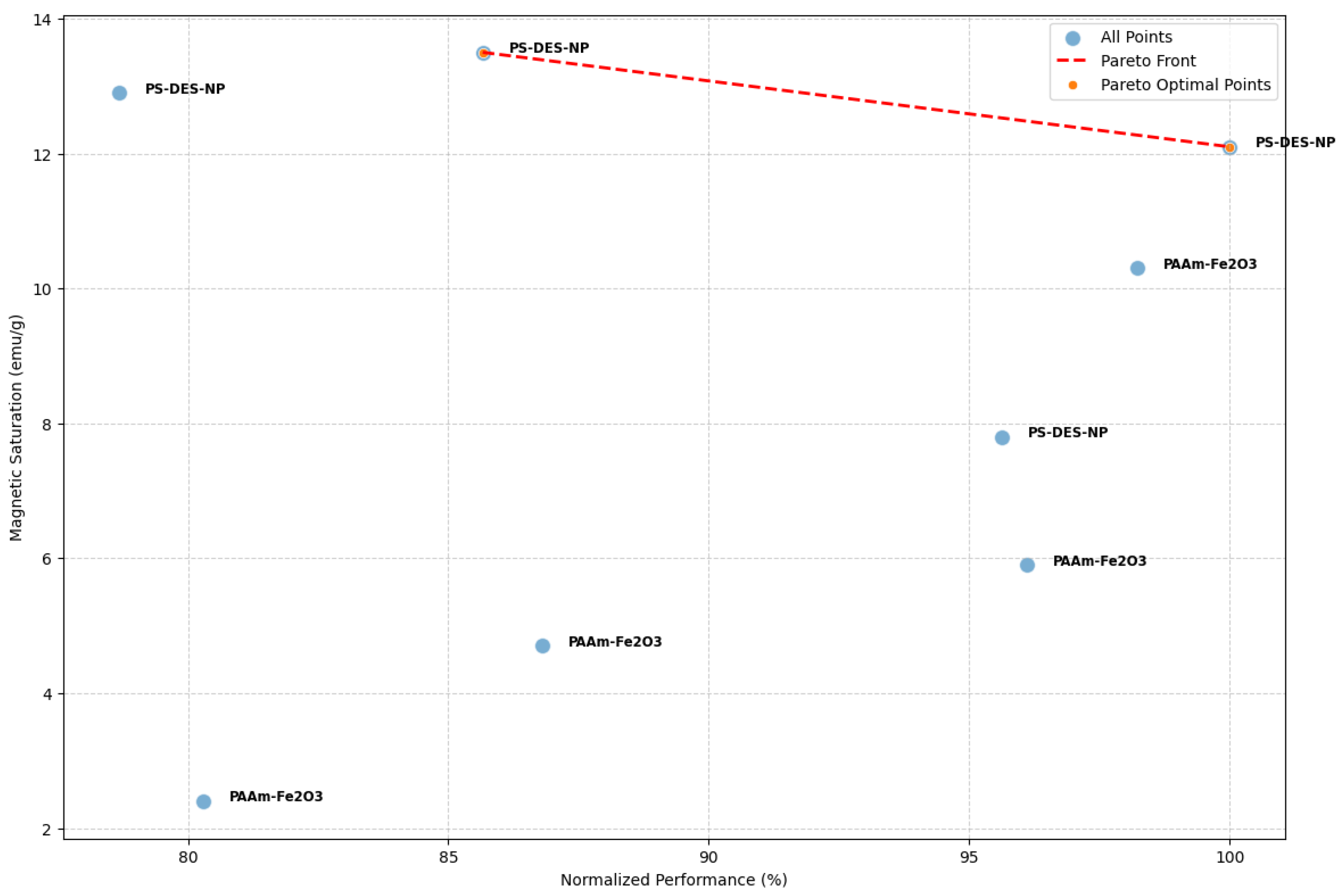 Figure 6 was constructed directly from the experimentally reported values of removal efficiency and magnetic saturation as competing objectives. A non-dominated sorting procedure was applied, whereby a sample was classified as Pareto-optimal if no other sample simultaneously exhibited both higher removal efficiency and higher magnetic saturation. This approach extracts trade-off relationships directly from the experimental design space without imposing any assumed functional form or optimization model.