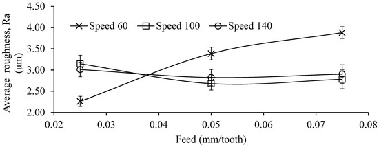 The average surface roughness of nano-MMCs machined at different feeds and speeds is shown in Figure 1 with respect to machining speed and feed rate. The trend of surface roughness changes with the change of machining conditions. When the machining speed is slow (60 mm/min), the roughness also appears to be lower at smaller feed but it increases with the increase of feed. However, at faster machining speeds (100–140 mm/min), surface roughness is higher at lower feed and then it decreases slightly with the increase of feed. Finally, it remains almost constant with a further increase of feed. Figure 1 also demonstrates that the lowest surface roughness is achieved at the smallest feed (0.02 mm/tooth) and slowest speed (60 mm/min).