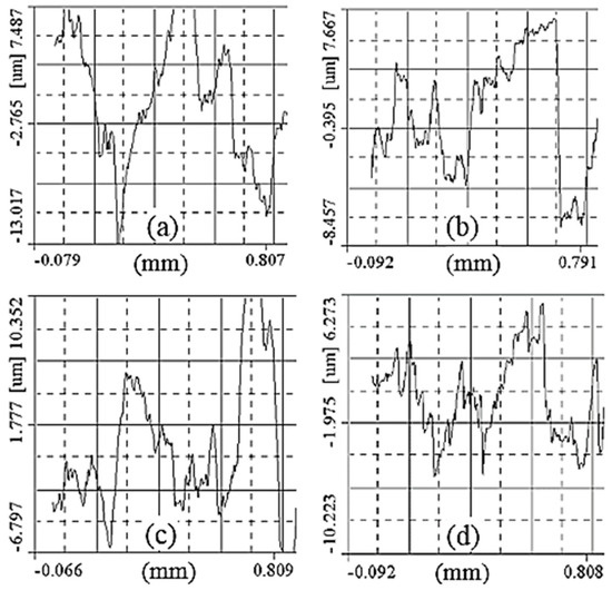 Surface profile of machined surface at: (a) 60 mm/min speed, 0.025 mm/tooth feed; (b) 60 mm/min speed, 0.075 mm/tooth feed; (c) 140 mm/min speed, 0.025 mm/tooth feed and (d) 140 mm/min speed, 0.075 mm/tooth feed.