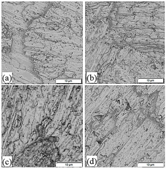 Figure 6 shows the bottom surfaces of the chips at different machining conditions. Apparently, bottom surfaces of chips got quite thicker layers of deformed materials (Figure 6b,d) due to their material flow at the higher feed irrespective of speed. The surfaces machined at lower feed show thin layers of deformed materials. Though the chip surfaces are very similar at both higher and lower speeds (Figure 6c,d), a close look reveals that the surface generated at higher milling speed is smoother owing to thermal softening of materials at the higher speed. It seems that at a lower feed the extended friction is more dominant and at higher feed both adhesion and material flow occur at tool-chip interface. Therefore, the chip ratio is altered accordingly.