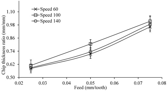 Chip thickness ratio of nanoparticles reinforced with Al-based metal matrix composites (nano-MMCs) at different feeds and speeds.