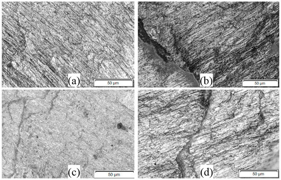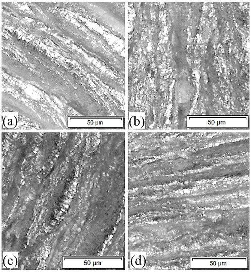 Morphology of the machined surfaces in different conditions: (a) 60 mm/min speed, feed 0.025 mm/tooth; (b) 60 mm/min speed, 0.075 mm/tooth feed; (c) 140 mm/min speed, 0.025 mm/tooth feed and (d) 140 mm/min speed, 0.075 mm/tooth feed.