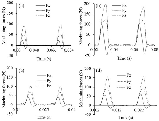 Force signals in different conditions: (a) 60 mm/min speed, 0.025 mm/tooth feed; (b) 60 mm/min speed, 0.075 mm/tooth feed; (c) 140 mm/min speed, 0.025 mm/tooth feed and (d) 140 mm/min speed, 0.075 mm/tooth feed.