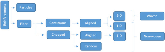 Natural fibre reinforcement may be divided in accordance with the length, dimension and orientation, as demonstrated in Figure 2. This can either be in the form of fibre or particle. The fibre itself is characterized as continuous or discontinuous (i.e., chopped) depending on its length-to-diameter (l/d) ratio. Commonly, the fibre-reinforced phase arrangement is classed as woven or non-woven. A woven fabric is characterized by continuous interlacing of perpendicular yarns, in a regular pattern. Yarns are structures consisting of several interlocked fibres. The twist angle is responsible for the cohesion of the fibres and yarn strength up to a certain point, beyond which, the maximum fibre strength decreases due to the increase in obliquity [5]. Moreover, the increase of the fibre twist angle is correlated with a decrease of fibre-resin bond strength, lower permeability and consequently poor mechanical properties [6]. When continuous fibres are used, the fibre architecture can have more than one-dimension [7]. In the one-dimensional architecture, the twist angle and the level of alignment of continuous-filament yarns play a significant role in determining the maximum applied load. For this reason, unidirectional composites tend to be weaker in the transverse directions [4,5]. Given these attributes, for a known state of stress, these anisotropic structures can exhibit at least 3 to 4 times better mechanical properties than their isotropic counterparts [8].