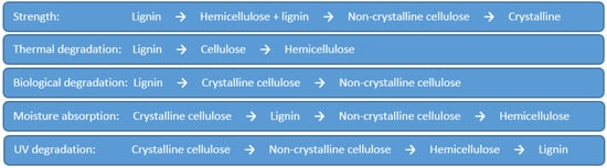 The large variety of properties are mainly dependent upon plant species, growth conditions and method of fibre extraction. Moreover, properties depend on the fibre cell geometry of each type of cellulose and its degree of polymerization [47]. It should be noted that linear cellulosic macromolecules are linked by hydrogen bonds and are closely associated with hemicelluloses and lignin which confer stiffness to fibre. Not only holds fibres together but also the cellulose within the fibre cell wall [48]. Figure 3 exhibits the influence of constituents on the properties of fibre.