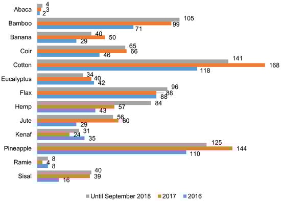 Despite the referred limitations, fibres are taking a growing interest by researchers. The bibliometric analysis in Figure 4 shows the number of research articles resident in the Science Direct database that meet the defined cross-reference search criteria (by search term: “fibre name” composite and by title or keyword: “fibre name”, including name alternatives for example, coir/coconut and pineapple/pine), from the year 2016 up to September 2018. For this study fibres with more than 20 publications in a given year were selected. For most of the fibres, the number of publications in 9 months of 2018 supersedes the number of publications in the whole year of 2017. Nevertheless, for the other ones the number of publications in 2018 is already very near the 2017 number, so it is expected that the number of publications in 2018 would be higher than that of 2017.