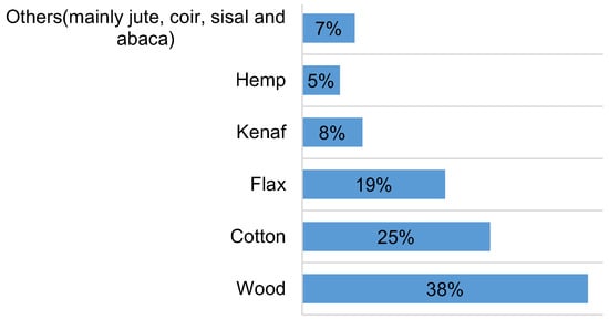 Different regions across the globe cultivate and use different types of natural fibres and sometimes they import or export to other regions as well. For instance, European automotive industry mainly uses flax and hemp, whereas jute and kenaf are mainly imported from Bangladesh and India, banana from the Philippines and sisal from South Africa, the United States and Brazil. Flax fibre has been the most relevant natural fibre for the German automotive industry [43]. Figure 7 shows the use of different natural fibres in European automotive industry with highest share of wood and cotton fibre followed by flax, hemp, kenaf and others. The European composites market as whole contains a 10–15% share of wood plastic and natural fibre composites [95].
