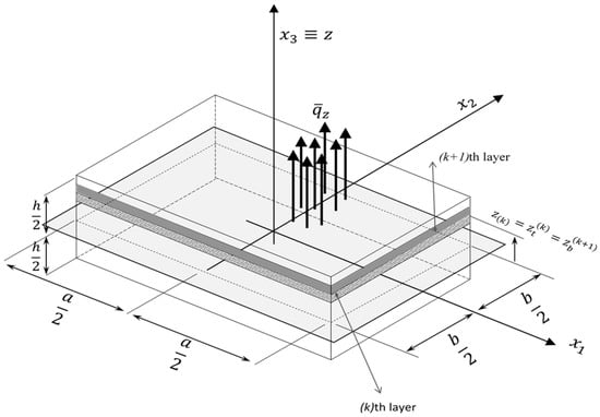 If not otherwise stated, the superscript (k) is attached to quantities of the kth layer (k = 1, N), whereas the subscript (k) is attached to quantities evaluated at the kth interface (k = 1, N − 1) between the k and (k + 1) layer. Also, we use the subscript b and t to indicate the top and bottom surfaces of the plate. For example, , and (see Figure 1 and Figure 2). The symbol refers to the partial derivative of the function with respect to the coordinate ; a dot over a quantity refers to the partial derivative with respect to time of that quantity. Finally, the Einsteinian summation convention over repeated indices is adopted, with Latin indices ranging from 1 to 3, and Greek indices ranging from 1 to 2.