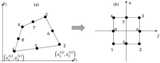 Eight-node quadrilateral plate element in the physical plane (a) and natural plane (b).