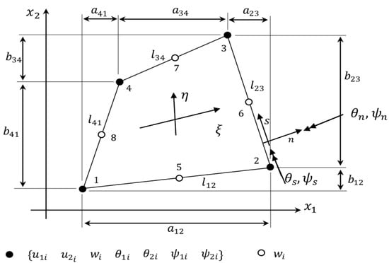 Eight-node virgin quadrilateral plate element. Geometry, physical co-ordinates (x1, x2), and natural co-ordinates (ξ, η). Boundary co-ordinate system (n, s). Definition of the parameters aij and bij entering in Equations (56) and (63) and the positive rotations (θ1, θ2) and (θn, θs).
